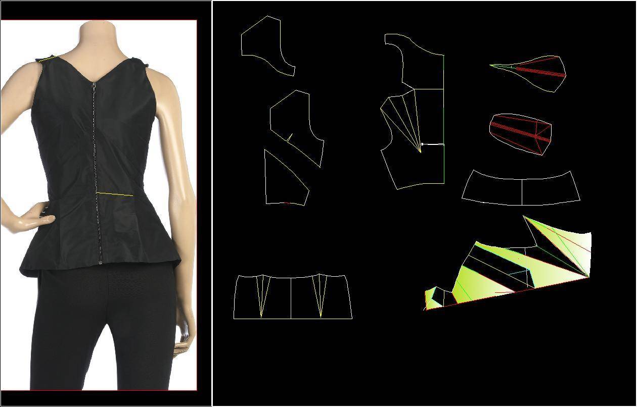 К конструкциям, требующим построения чертежа и моделирования, относятся подрезы, кокилье, кокетки, детали, созданные на их основе и требующие точного расширения. К примеру, это могут быть воланы со складками или кокетки с драпировкой. Без чертежа не обойтись и при построении цельнокроеной баски.