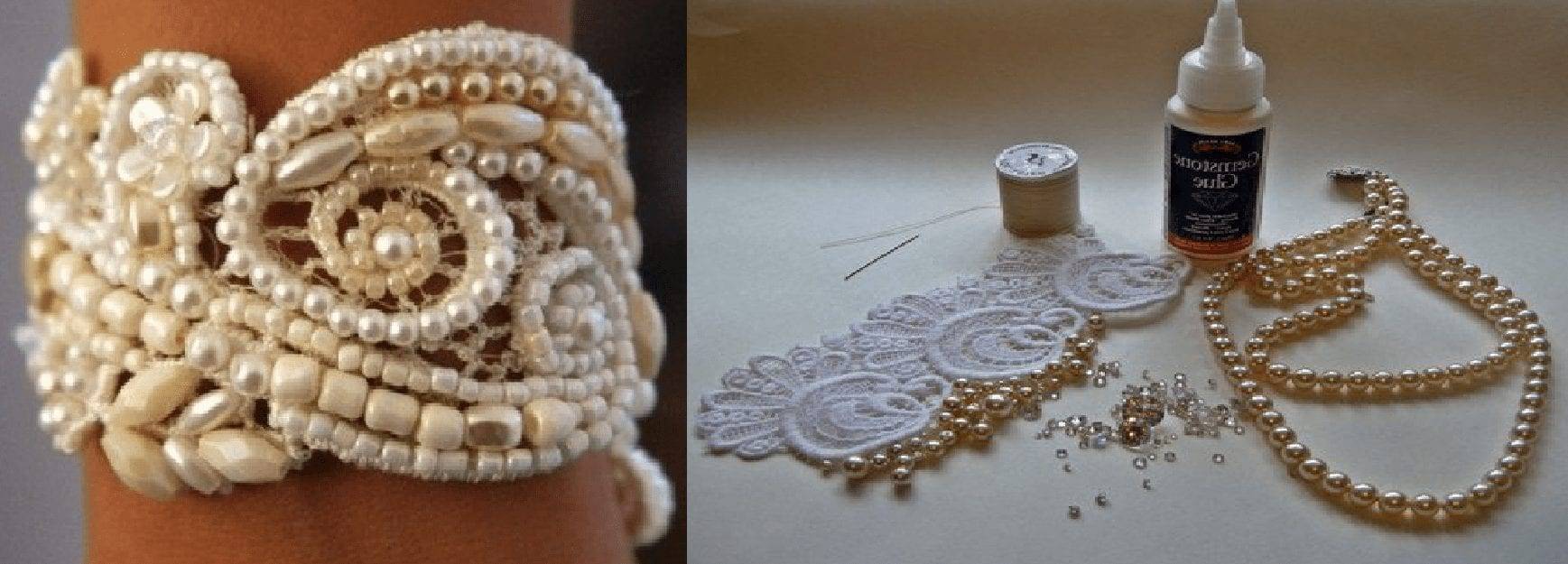 Если этот способ вам покажется сложным, можно сделать модную бижутерию своими руками с применением бусин еще проще. Например, выбрать красивое кружево и приклеить их, повторяя его узор.
