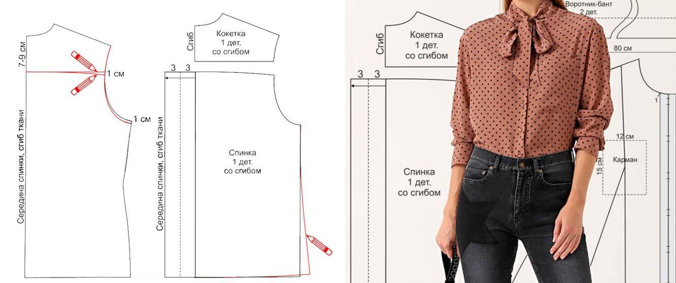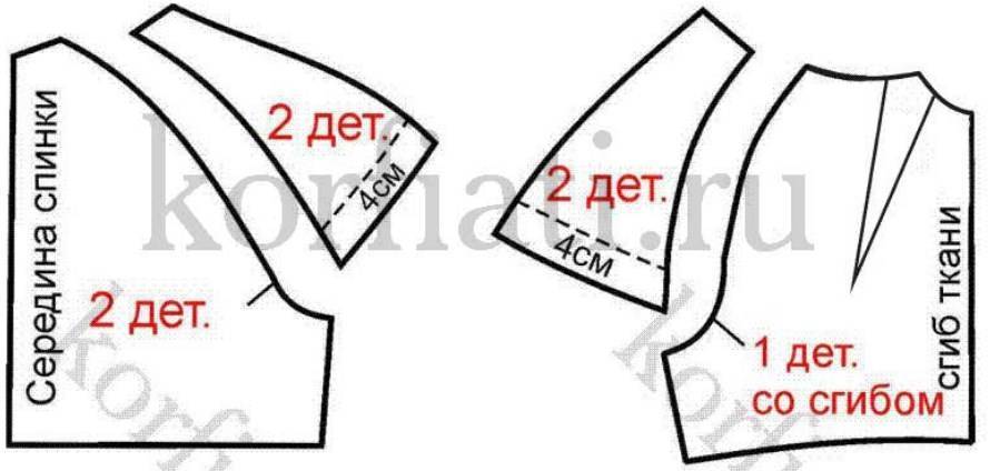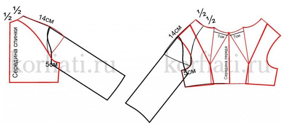 - от плеча полочки откладывается 2 см и проводится новая плавная линия горловины переда и проймы;
