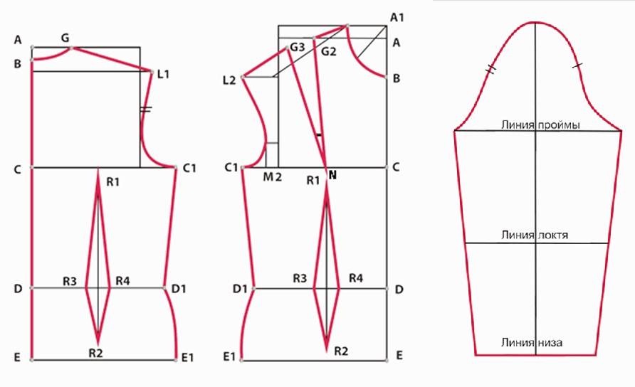 Точно так же моделируем вторую половину рукавчика реглан для задней части платья. Готовая выкройка рукава реглан показана на четвёртой схеме.