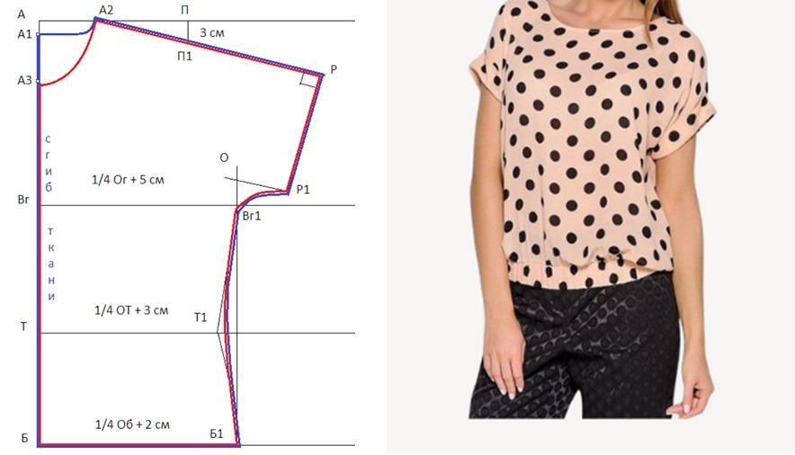 Выкройка блузки построена без припусков на швы, ко всем срезам их следует добавить самостоятельно. Для летних изделий из хлопковых тканей обычно делают прибавки на швы 1 см или на ширину лапки для обычной швейной машинки. К низу добавляем припуск в зависимости от выбранного вами метода обработки, для подрубки специальной лапки прибавим 0,3-0,4 см, для двойной подгибки — 2 см. К горловине лучше сделать прибавку на ширину лапки, чтобы было удобнее втачивать воротник.