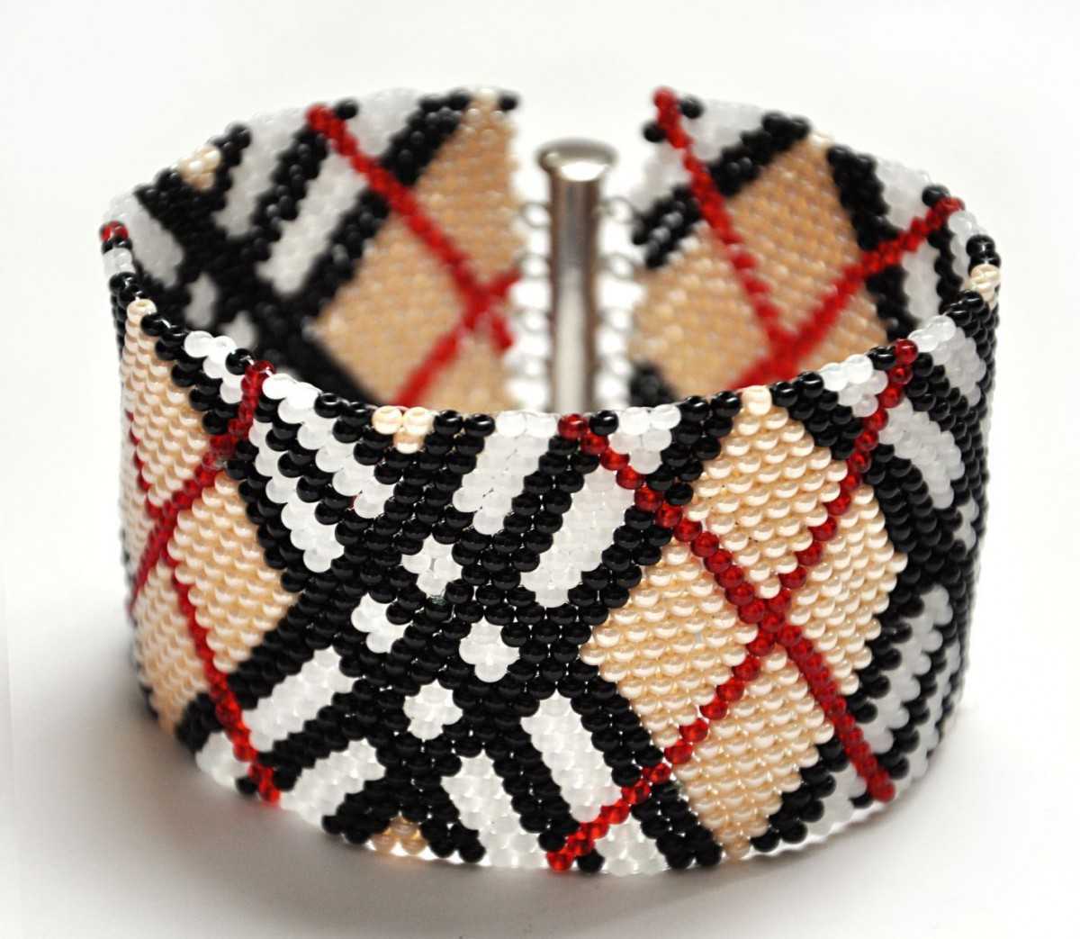 Браслет из бисера в цвете черный с белым не обязательно должен быть в один ряд. Чтобы немного выделиться, достаточно проявить больше фантазии, например, между бусинами пустить несколько складок ленты, либо использовать плетение. Несколько лент с бусинами переплетите в косу, чтобы получить широкий оригинальный браслет. Схема работы проста:
