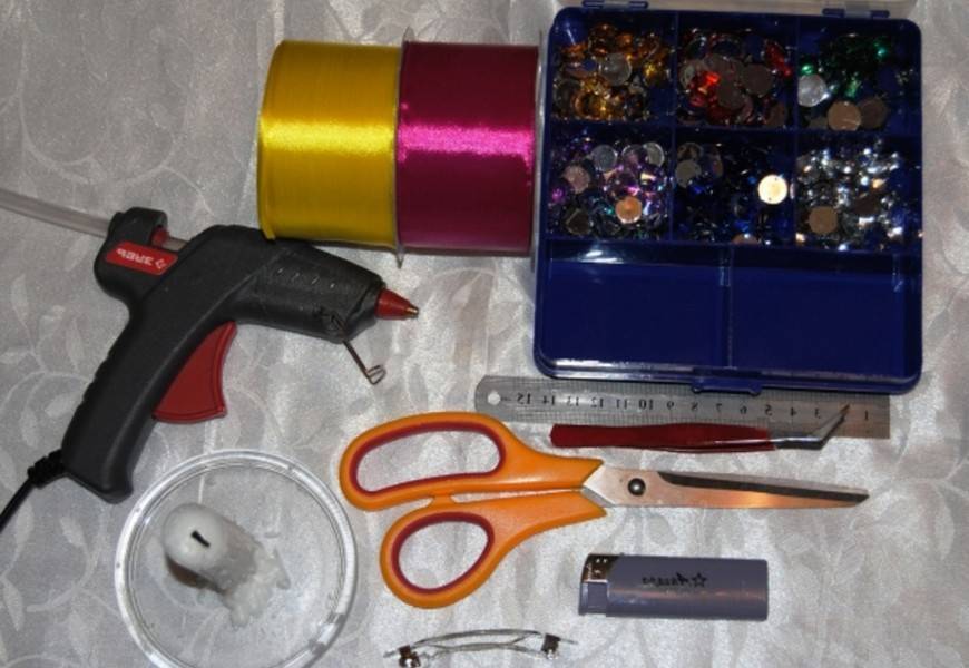 Для работы нам потребуется: атласная лента, диски компьютерные, декоративные камни или бусины, шпажки, клей для ткани или пистолет для горячего клея, иголка с нитками, булавки, паяльник, пинцет, ножницы, пистолетный нож, линейка, свеча. Если все подготовлено приступаем: