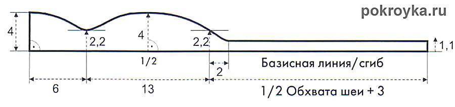 Основой базисной сетки является горизонталь, на которой нужно отложить от линии середины спинки влево значение половины Обхвата шеи плюс прибавка (здесь: 3 см). Получено местоположение линии середины переда на галстуке.