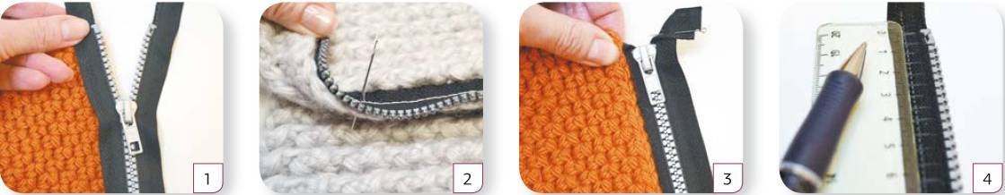 Молнии бывают разъемными или неразъемными, но принцип вшивания их в полотно одинаков за исключением того, что разъемную удобнее полностью расстегнуть и пришивать каждую часть по отдельности. Чаще всего молнии продаются фиксированной длины, поэтому проще подогнать размер полотна до размера молнии, чем изменить размер молнии. Вшить молнию в вязаное полотно гораздо проще вручную, чем на машинке. Если на место вшивания молнии приходится боковой край вязаного полотна, то его лучше сначала обвязать с помощью столбиков без накида (СБН) (см. п. 4-6 здесь).