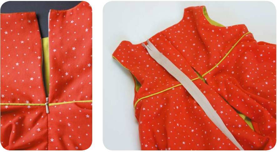Закончите сборку изделия: вновь установите лапку для втачивания молнии и прострочите обе детали, начиная от последних стежков, выполненных у основания потайной молнии (на уровне ограничителя).