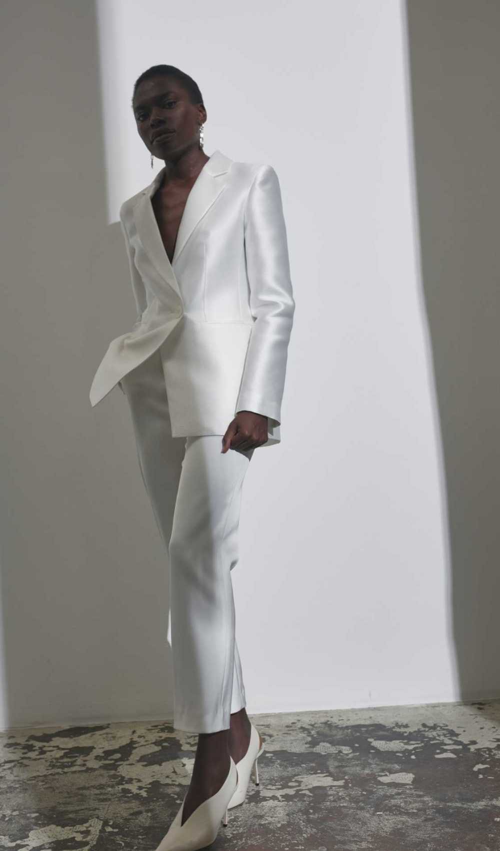 Невеста может предстать перед гостями в деловом костюме. Классическая шляпа и маленькая сумочка, минимум ярких украшений – строгая леди с таким же строгим букетом.
