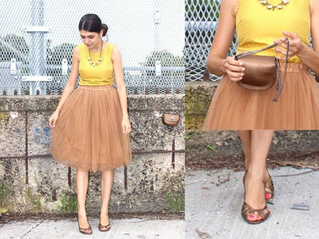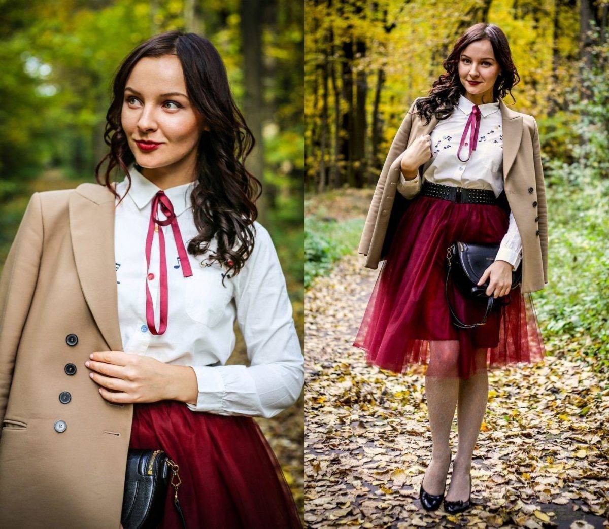Можно создать повседневный образ, используя минимум деталей. Для фатиновой юбки бежевого, коричневого, темного синего или бордового оттенков подойдут: