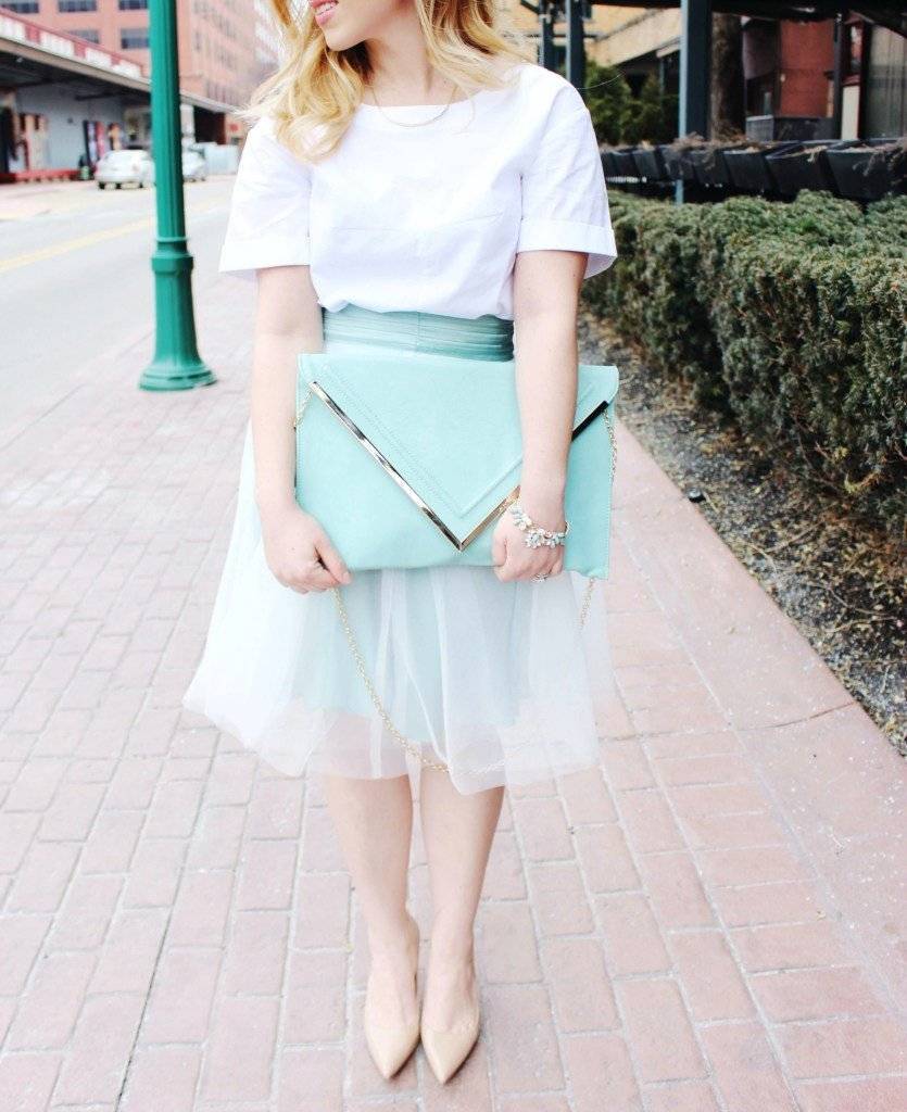 Когда на улице еще прохладно, но при этом хочется сделать свой образ легким и летним, стоит надеть пышную юбку пачку. Идеальным станет сочетание такой юбки с тонким свитером из ангоры одинакового с ней тона. Стоит заметить, что такой вариант подойдет только стройным девушкам с тонкой талией.