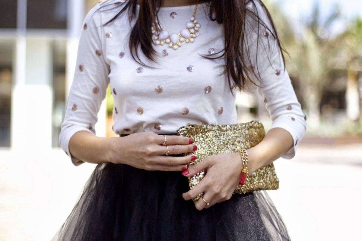Расположить украшение можно в любом месте, как снизу, так и по всей юбке. Например, низ юбки можно украсить стразами или нашить пайетки в виде цветов. С помощью бисера и бусин можно выложить надпись или рисунок.