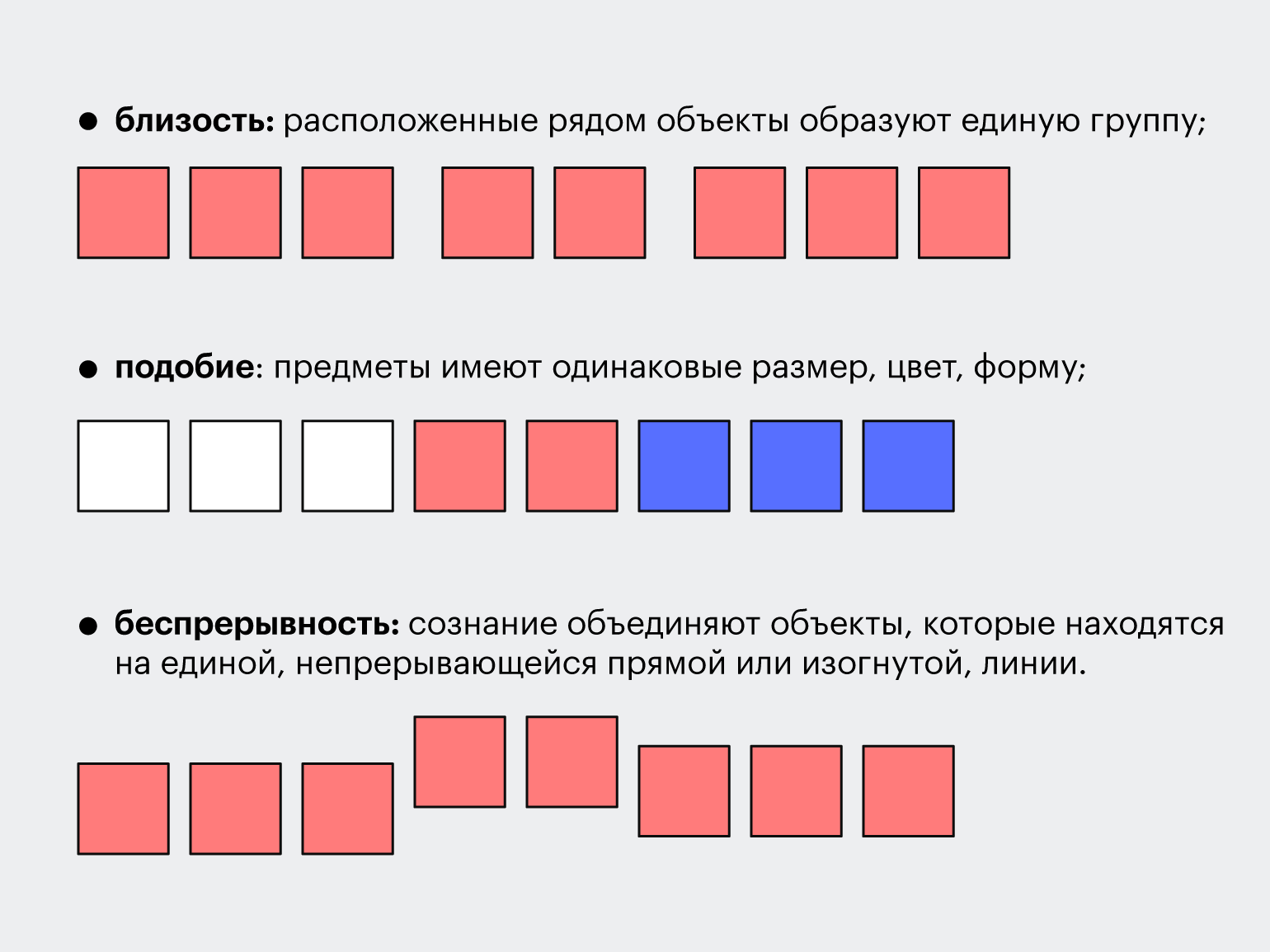 В начале XX века немецкие психологи Макс Вертгеймер и Курт Коффка провели исследования восприятия человеком окружающего мира. Они выявили ряд законов, которые учитывают естественное стремление человека найти порядок в беспорядке. Их эксперименты показали, что когда мозг обрабатывает полученные образы, он воспринимает ряд разрозненных элементов как единое целое. То есть подсознательно зритель пытается группировать похожие элементы, распознавать закономерности и таким образом упрощать сложные образы.