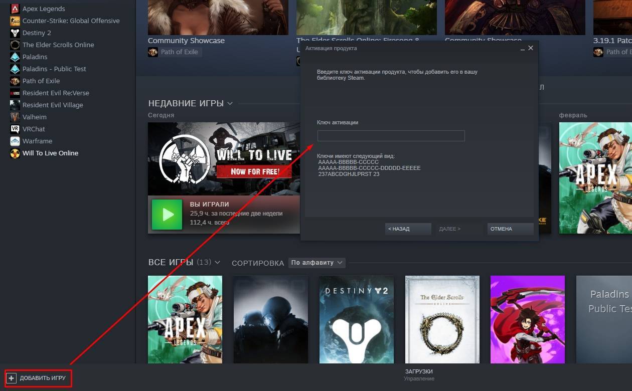 После оплаты товара вы получаете электронный ключ, который нужно активировать в Steam в специальном разделе (см. изображение ниже). Как только вы завершите процедуру активации игры, она появится в вашей библиотеке.