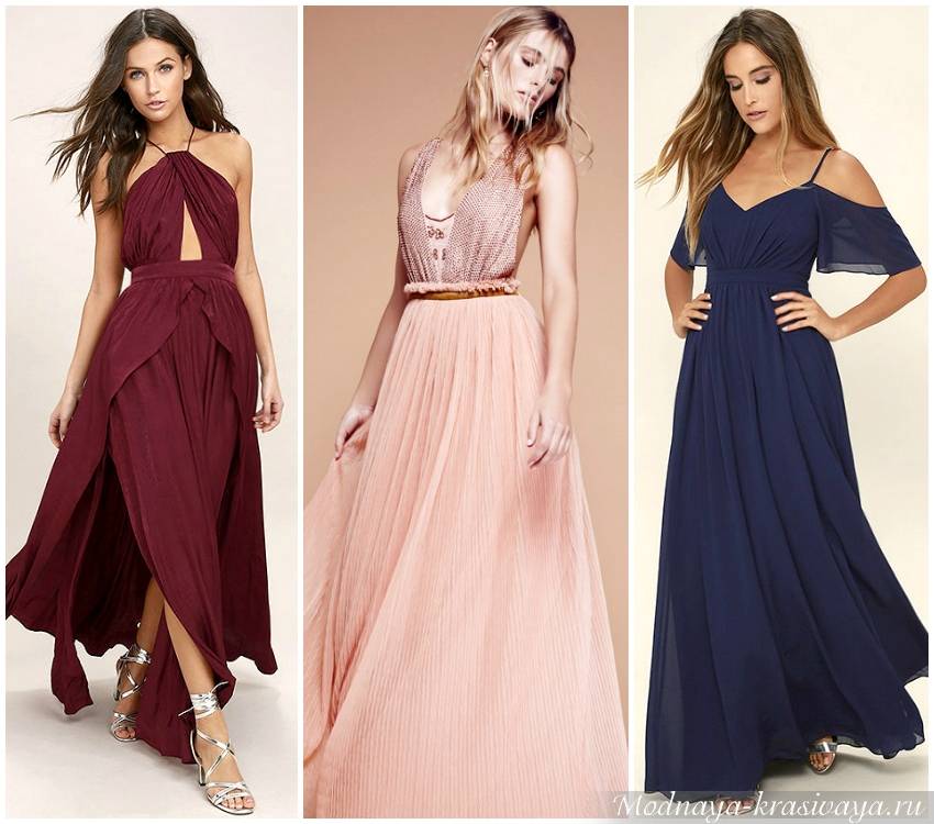 Девушкам с округлыми формами и ровной осанкой идеально подойдут платья приталенного кроя, облегающие в зоне декольте и свободно ниспадающие в области бедер — они помогут сделать акцент на точеной талии и отвлечь внимание от нижней части тела. На стройных леди хорошо смотрятся платья со сложной драпировкой или ассиметричным запахом
