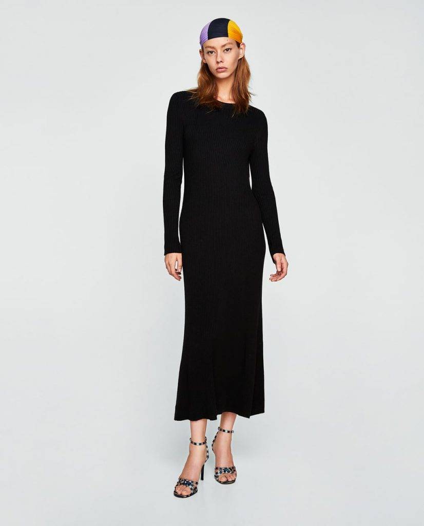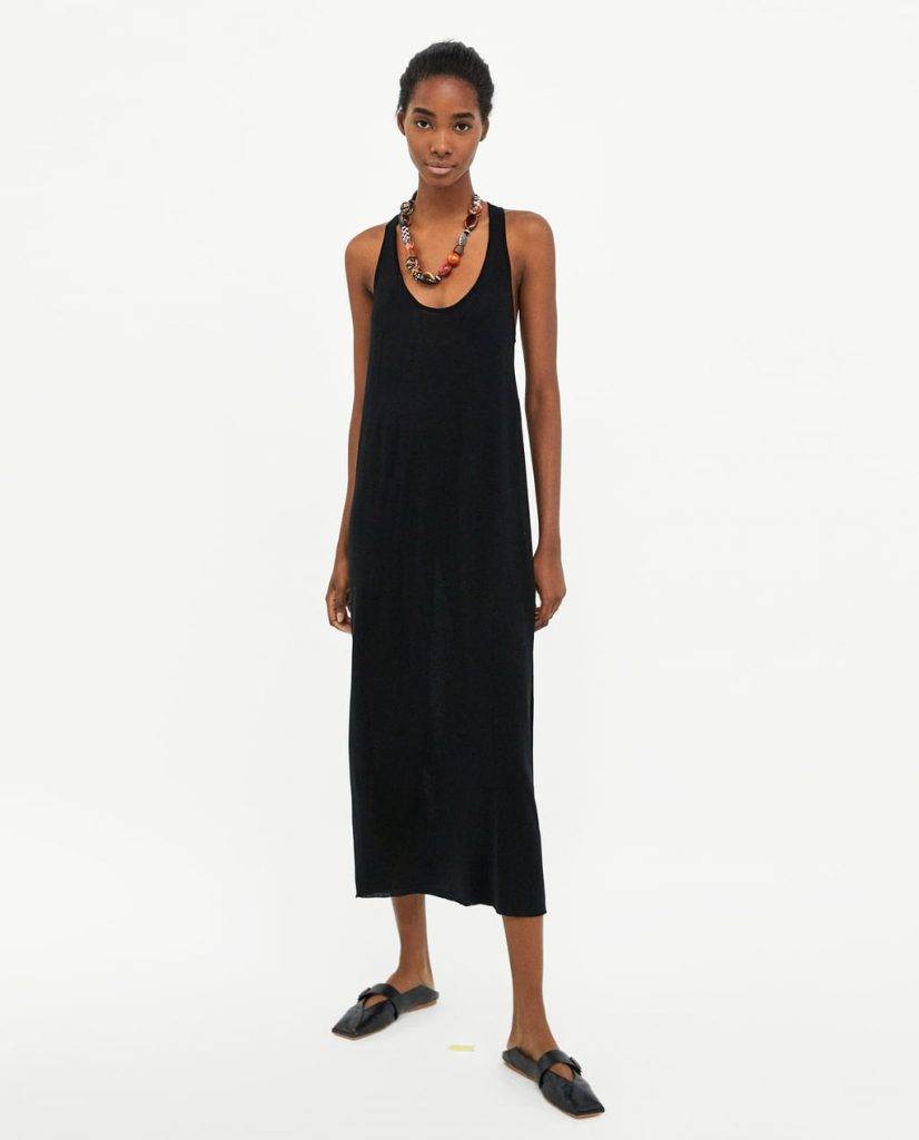 На каждый день выбирайте обувь на плоском каблуке — с черным платьем и балетки, и сандалии, и мокасины смотрятся великолепно.