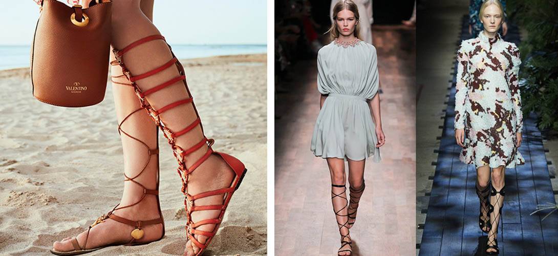 Сандалии-гладиаторы могут быть слишком простыми для офиса, но для других случаев – в самый раз. Независимо от того, заканчиваются «гладиаторы» на щиколотке или идут выше по голени – они сочетаются с платьями макси и мини, с завышенной талией и бретельками на шее;