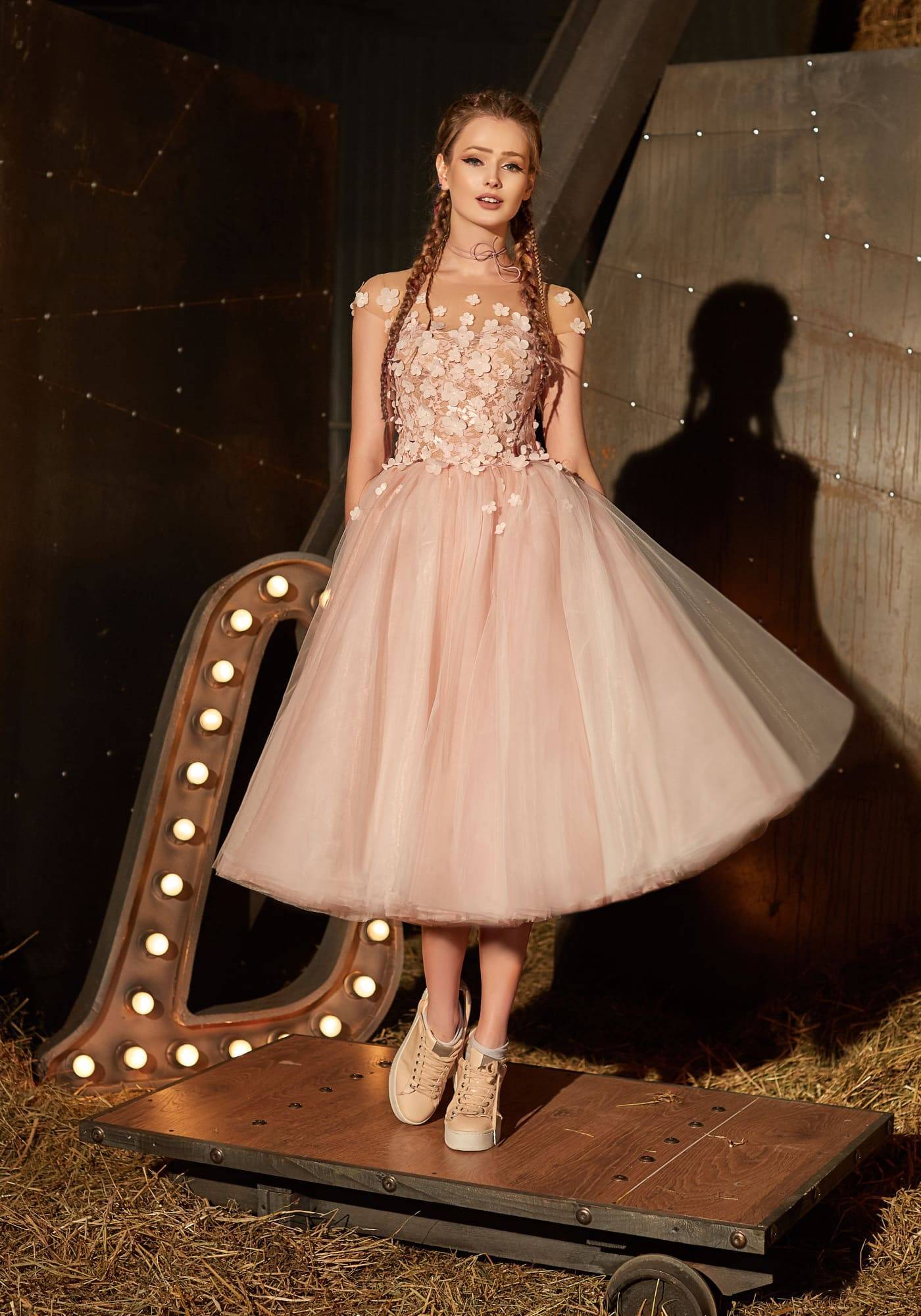 Спортивная обувь под платье ниже колена подходит идеально, однако ее нужно подобрать грамотно. Для пышных и летящих моделей лучше выбрать минималистичные кеды без лишнего декора. Оттенок лучше выбирать классический или в тон наряду. Кеды можно сочетать даже с праздничными моделями, получится эффектный романтичный ансамбль с элементами эклектики, сейчас подобные сочетания на пике популярности.