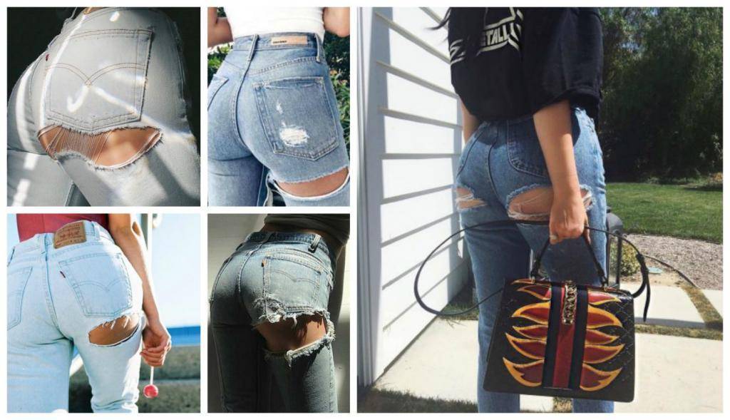 Также одной из неоднозначных моделей рваных джинсов на высокой посадке являются джинсы с дырками на ягодицах. Такой тип джинсов был предложен Кайли Дженнер, и его лучше сочетать со свободными футболками и спортивной обувью.