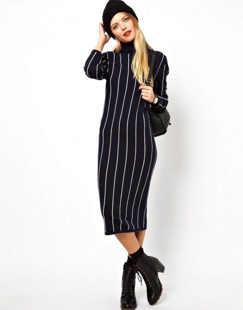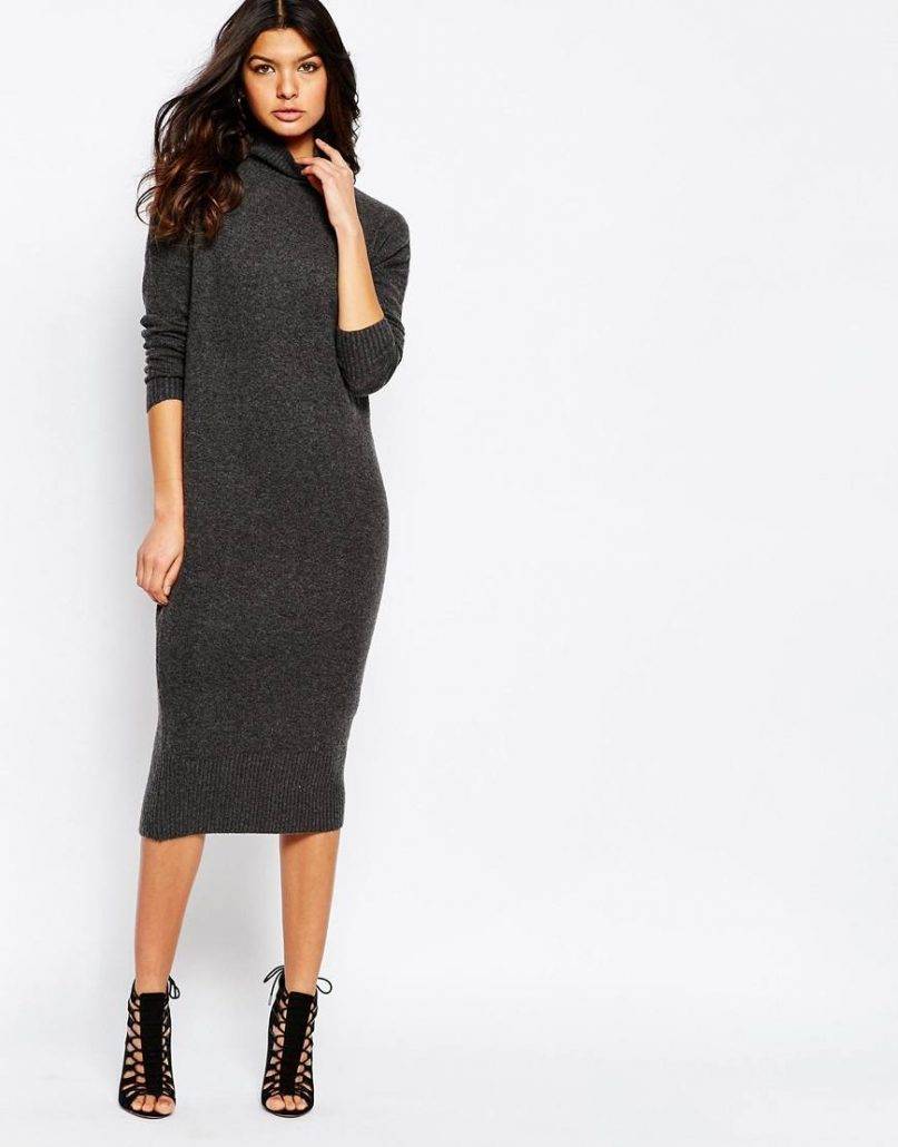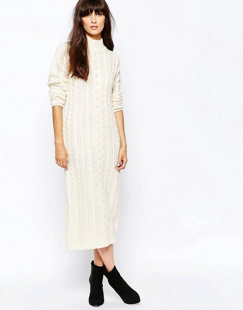 Модели вязаных платьев макси также выглядят стильно, но подходят скорее для поздней осени и сухой погоды. Для сугробов или слякоти длина макси будет крайне непрактичной. Остановите свой выбор на теплом платье до колена или середины икр, и вы не прогадаете.