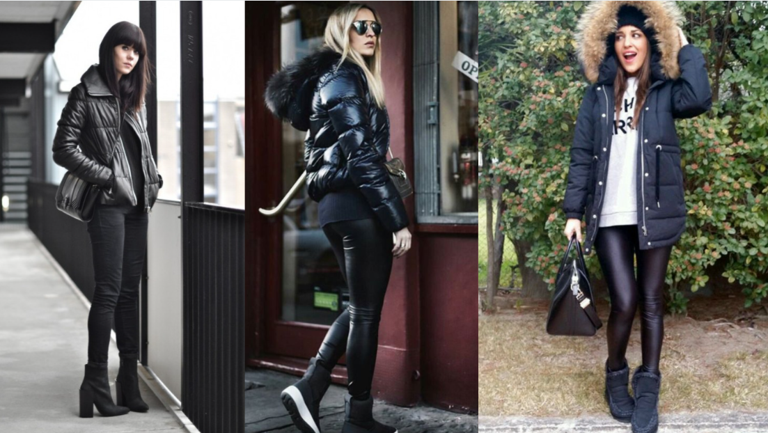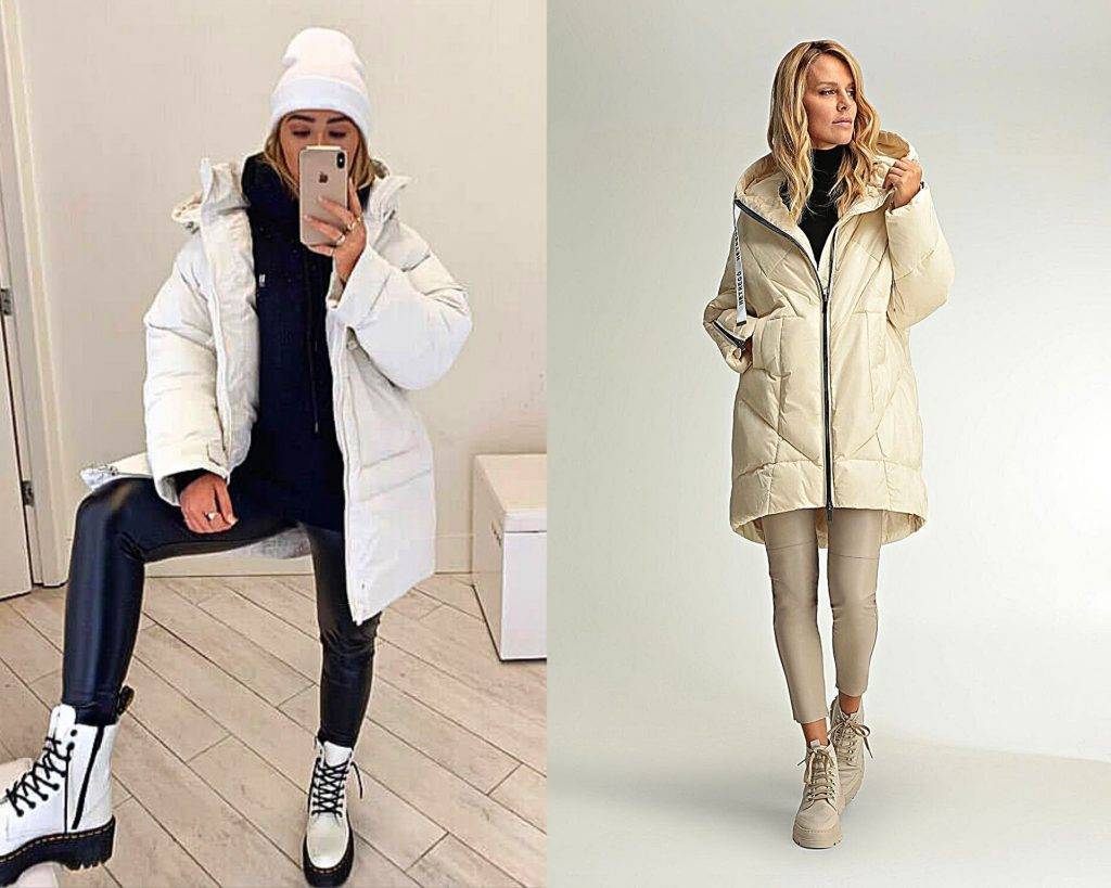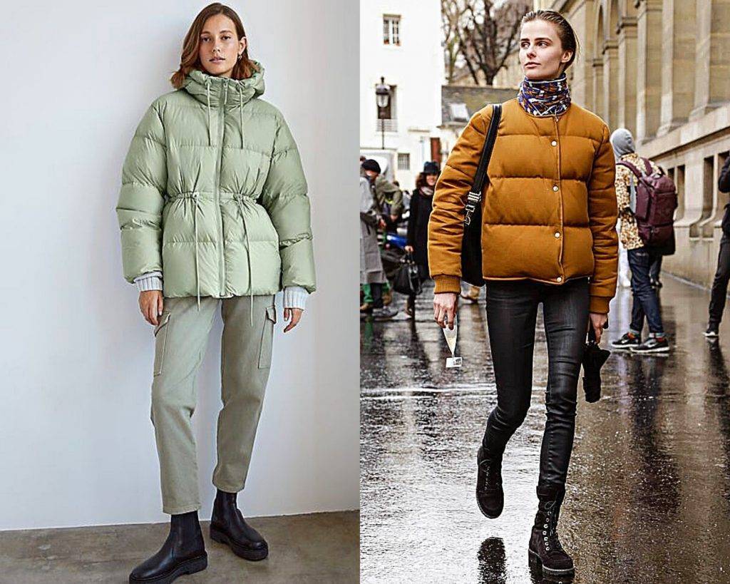 Стилисты советуют пуховик всё с теми же грубыми ботинками, кроссовками, ботильонами, сапогами на платформе.