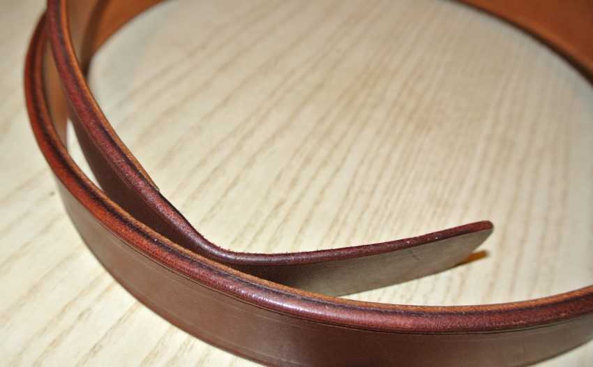 Формируем «хвост» ремня. Нужно отмерить линейкой углы, которые предстоит стесать и быстро срезать их специальным ножом или бритвой. Затем все тщательно зачистить. Гладкости можно добиться, применив шлифовальный станок.