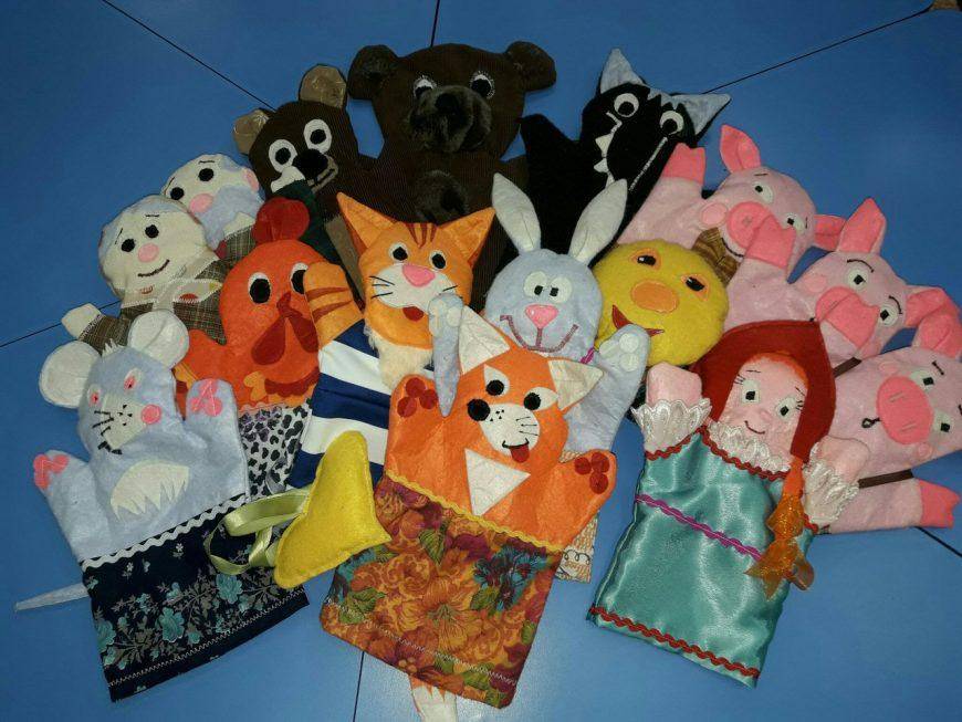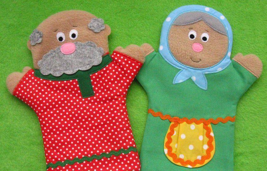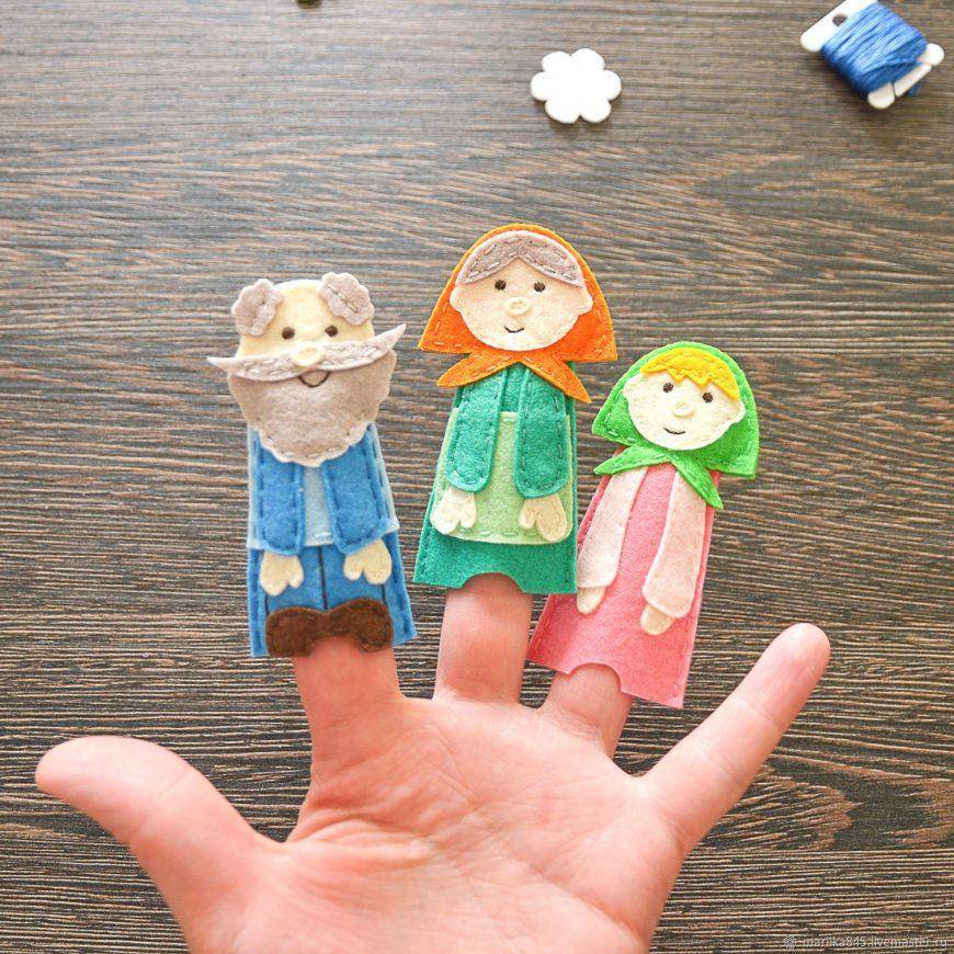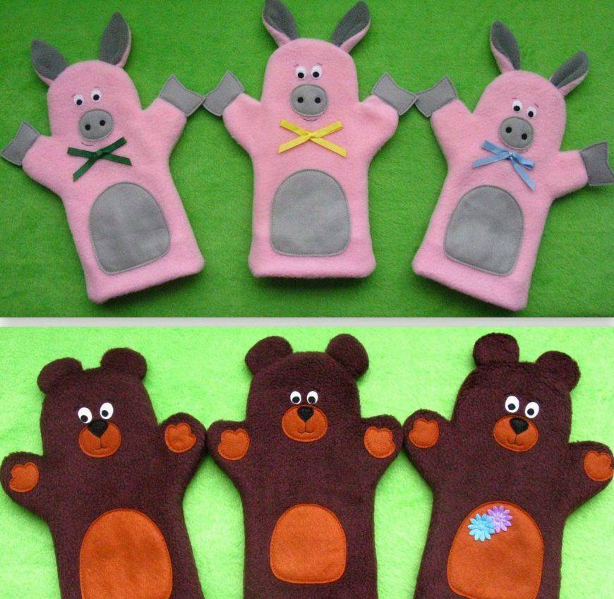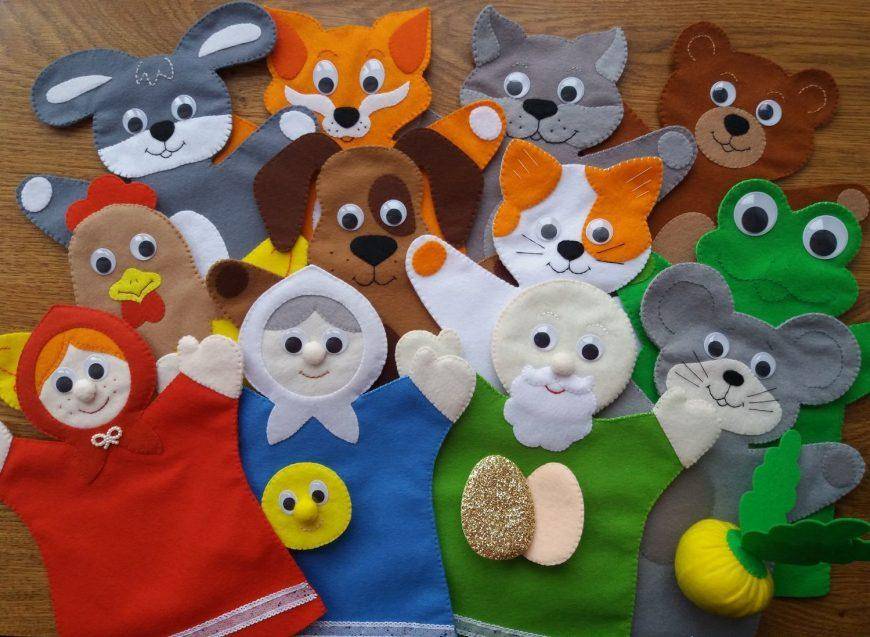 В интернете очень большое количество выкроек для кукольный театр из фетра своими руками. Этот материал плотный, хорошо держит форму, имеет яркие насыщенные цвета, его края не мохрятся и не осыпаются. Достаточно распечатать выкройки на бумаге, далее по выкройкам вырезать заготовки и сшить их вручную.