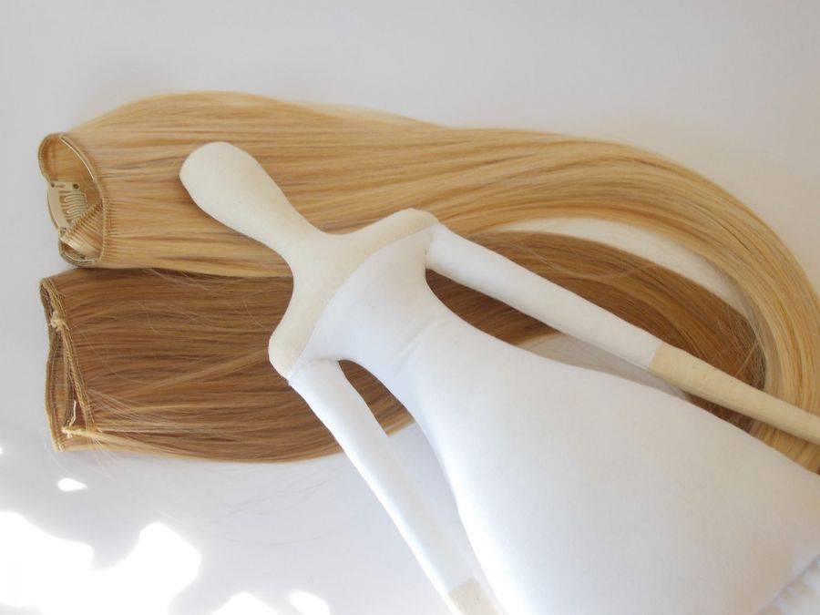 Тканевые куклы обычно имеют красивые волосы. Для их крепления вы можете использовать горячий пистолет. Куклу перед этим можно упаковать в пакет, чтобы не испачкать. Если у вас нет горячего пистолета, можно пришить трессы руками. Перед работой с ними следует сделать рулончик, диаметр которого составляет 1 см. Затем волосы наматываются и сшиваются. На голове имеются два шва в боковых частях. Первый ряд намечается и приклеивается от одного шва до другого. Второй и последующей ряды нужно приклеивать, начиная от лица.