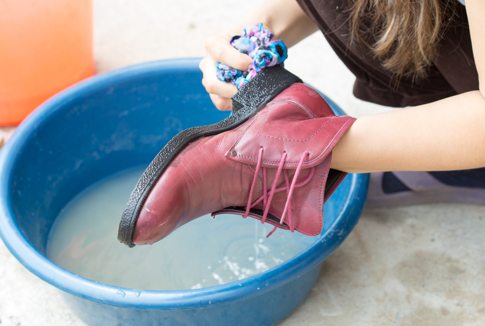 Если на дворе осенняя непогода или мартовская слякоть, можно промыть ботинки под струей воды, чтобы очистить грязь с подошвы. Мыть обувь начинают с каблука