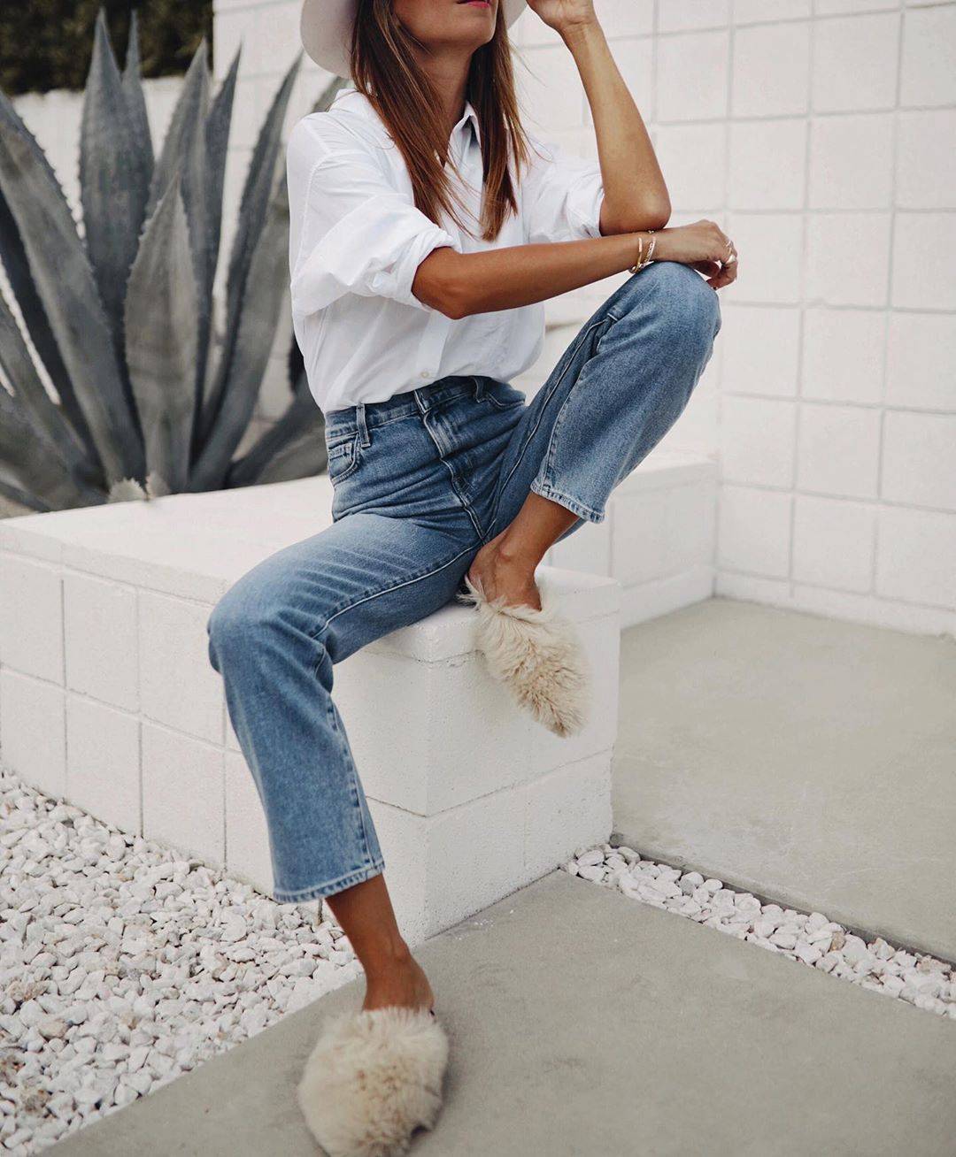 Интересный и несколько дерзкий образ получится, если использовать в образе с джинсами и рубашкой шляпу, а также модные меховые тапочки.