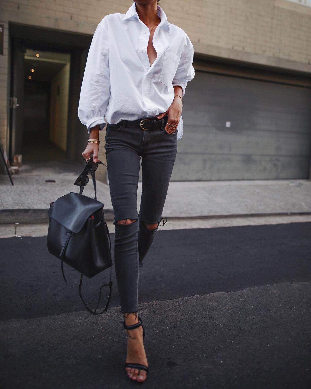Хотите выглядеть элегантно и со вкусом? Тогда предлагаем вам облачиться в классическую белую рубашку мужского кроя в сочетании с темно-синими джинсами скинни. Небольшая сумочка и туфли на каблуке станут завершающими штрихами образа.