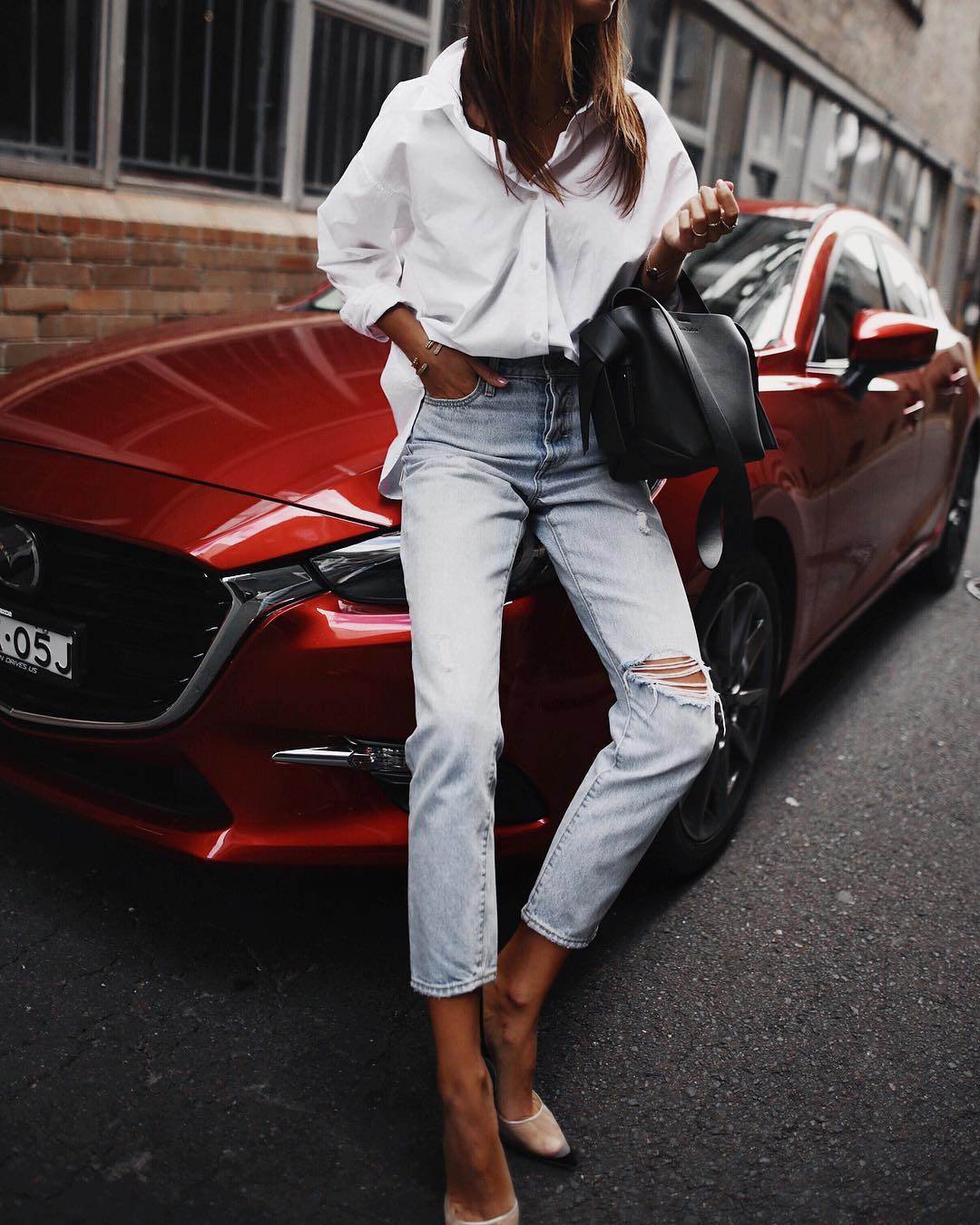 Для стильных джинсовых брюк типа момсов или бойфрендов отлично подойдет рубашка свободного кроя средней длины – пусть она чуть прикрывает ягодицы, но не превращается в тунику. Подойдет и белая рубашка оверсайз, но только в случае если ты готова к слегка небрежному аутфиту.