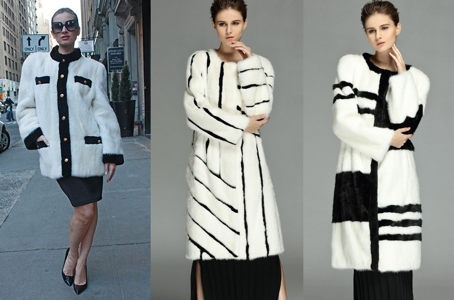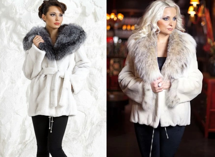 Оригинально смотрятся изделия с сочетанием белого меха с другими оттенками. Самый распространенный вариант – белый с черным. Вставки другого цвета помогут подчеркнуть какие-то особенности фигуры. Нейтральным ансамблем будет сочетание белого с серым. Пепельный цвет сделает дизайн белой вещи более завораживающим. Для таких шуб иногда предлагаются контрастные пояски.