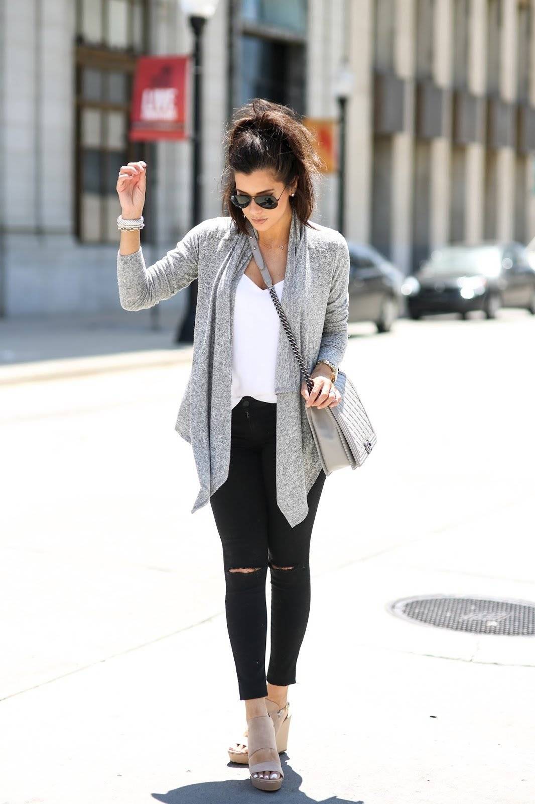 В большинстве случаев кардиган надевают поверх водолазки, кофты с круглым или V-образным вырезом, футболкой и другими вещами. Девушка может сочетать свободный верх с узкими брюками, обтягивающими леггинсами, джинсами-скинни с высокой талией, стильной обувью. Белый кардиган завершает общий образ.