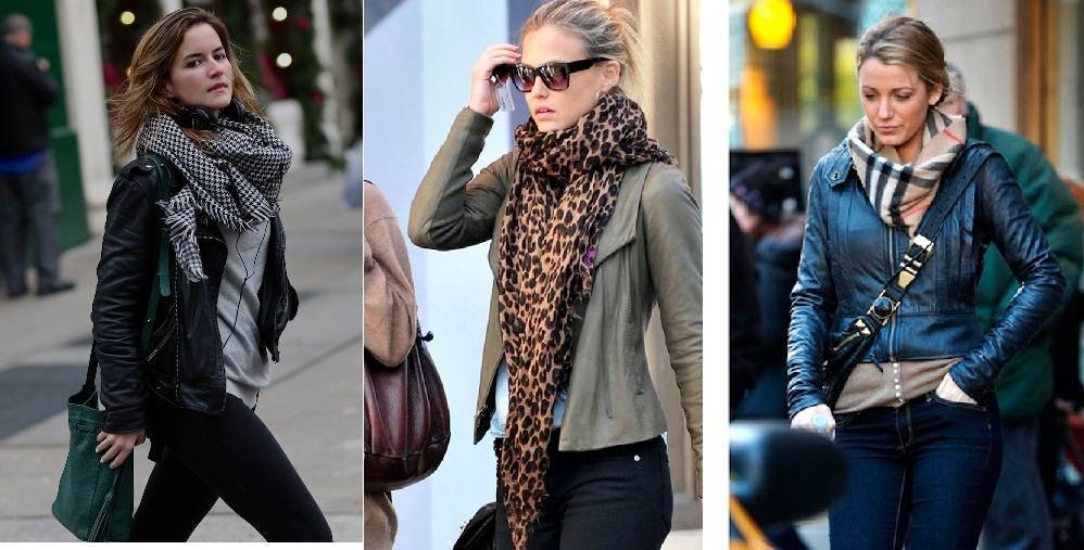 Для курток-косух подойдет техника завязывания шарфов треугольником либо свисающим с одного плеча концом ассиметричной формы завязки.