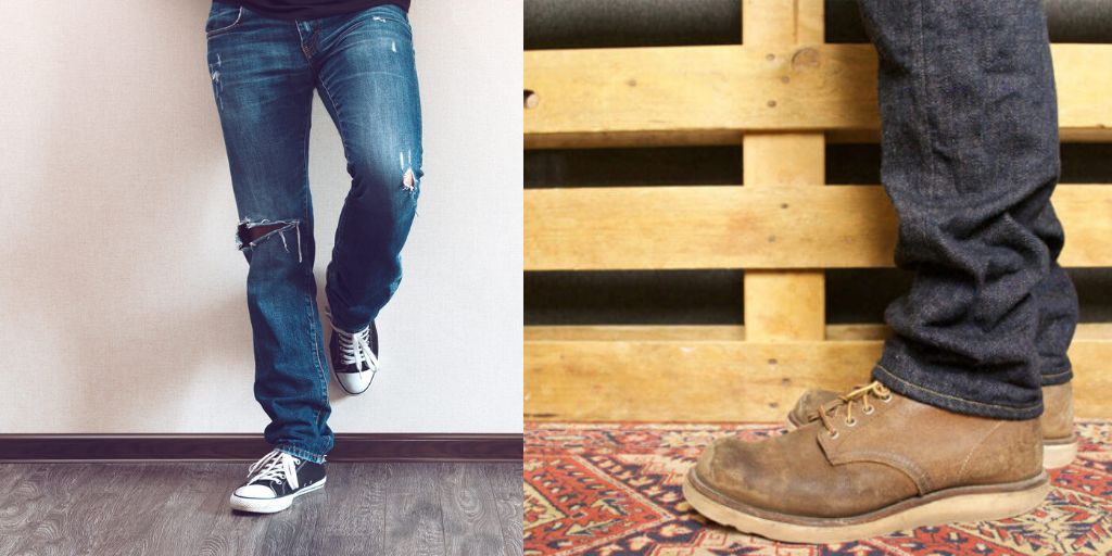 - Использованная ранее у мужчин длина джинс была непререкаемой аксиомой – край должен был почти прикрывать обувь, и при этом на них не должно было образовываться складок. Стилисты до сих пор уверены, что именно такой покрой идеально способствует стройности силуэта и визуально удлиняет ноги.