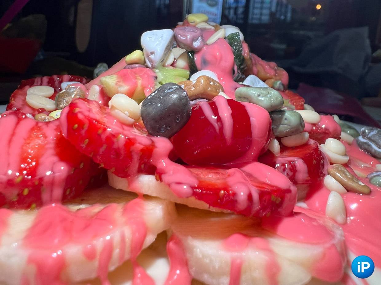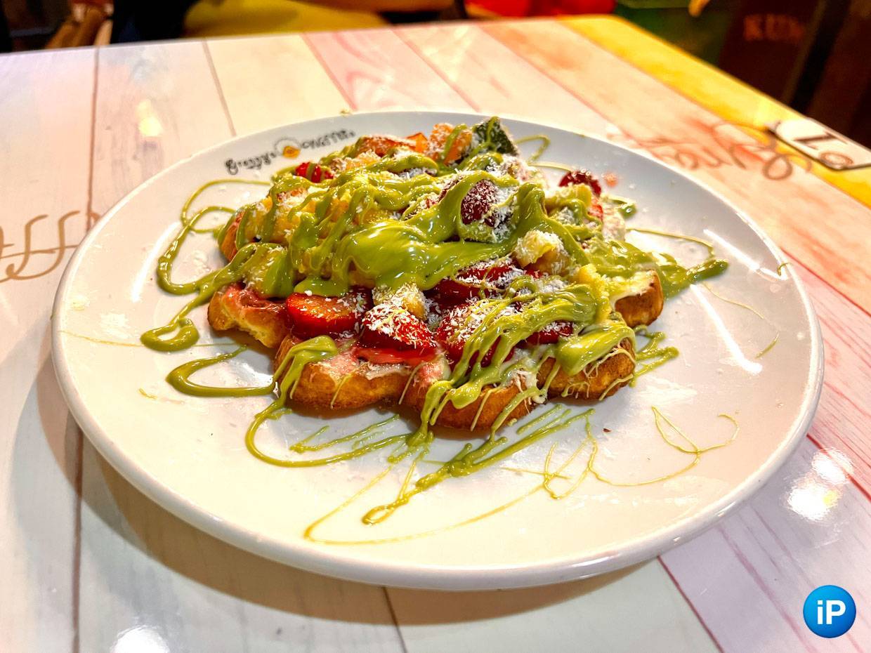В вафлях выбор до трёх сиропов, любые фрукты из списка (клубника невероятная), посыпки, жидкий шоколад, желе, ягоды в карамели, драже и так далее.