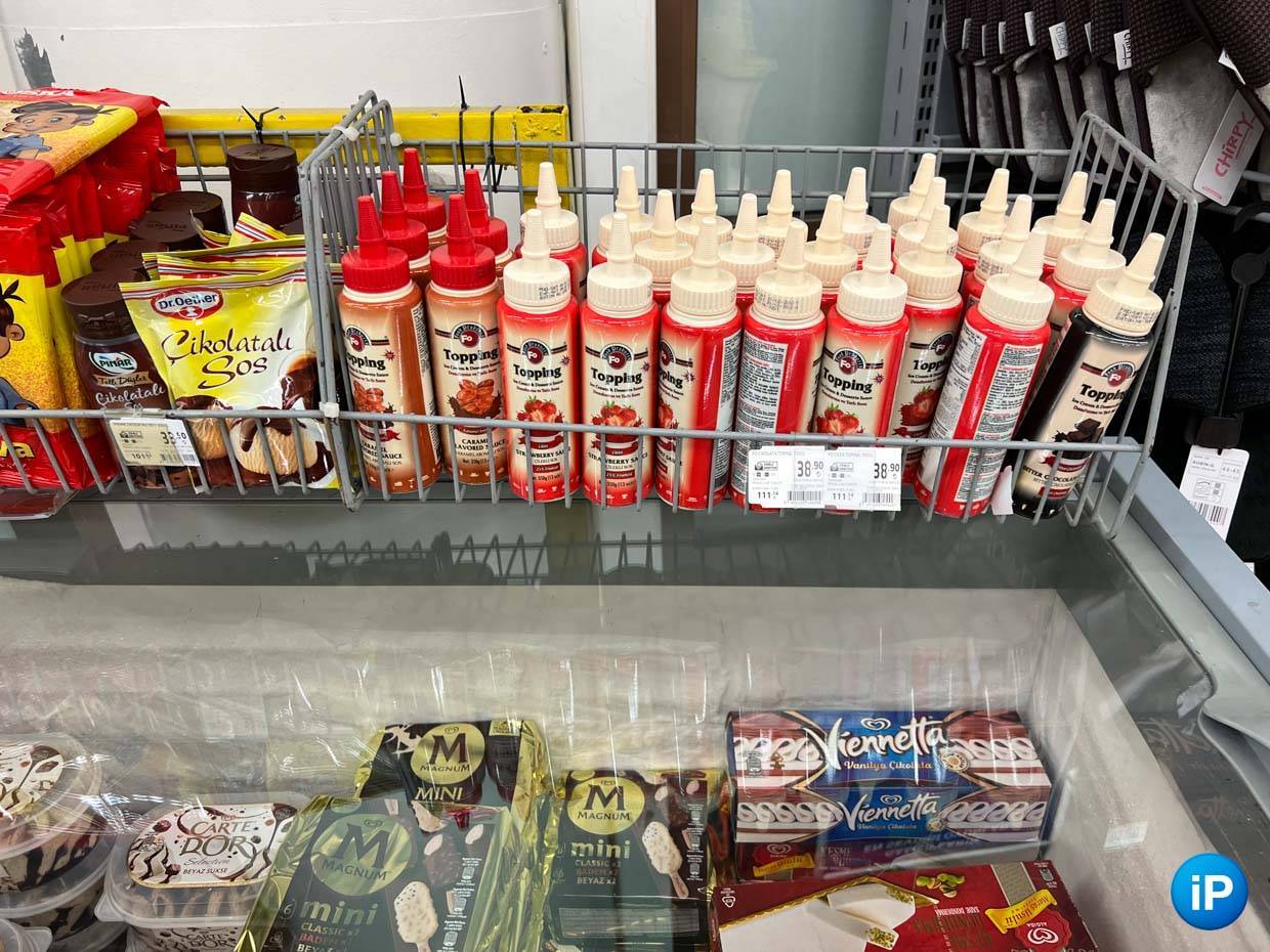 Рядом продают вафельные стаканчики и сладкие соусы, намекая на «сделай рожок сам»