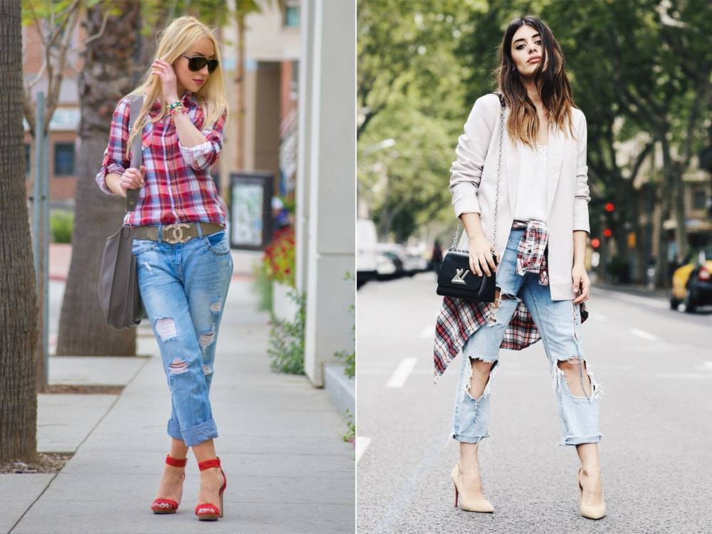 Модные многослойные образы собираются и с бойфрендами. Поверх однотонной футболки наденьте популярную рубаху в крупную клетку. Можно поступить и наоборот, надев классическую белую рубашку под лёгкий свитер.