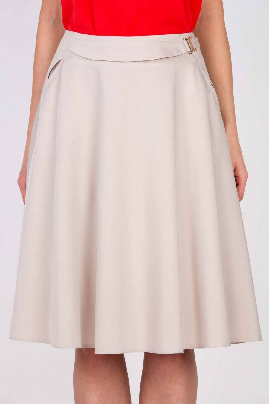 Модель плотно облегает талию и расширяется книзу без складок и драпировок, за счет кроя.