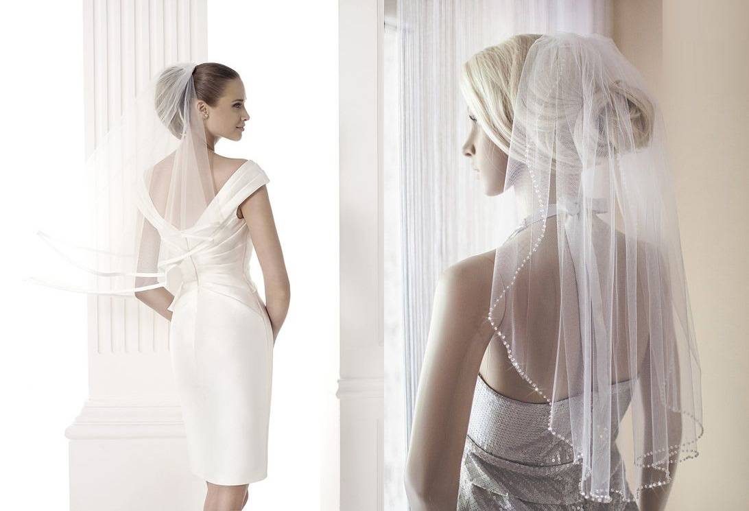 Короткая модель подходит, если акцентировать внимание необходимо на украшении в зоне шеи (ожерелье, подвеске). Длинный фасон (соборный) стоит выбрать для классического свадебного наряда со шлейфом