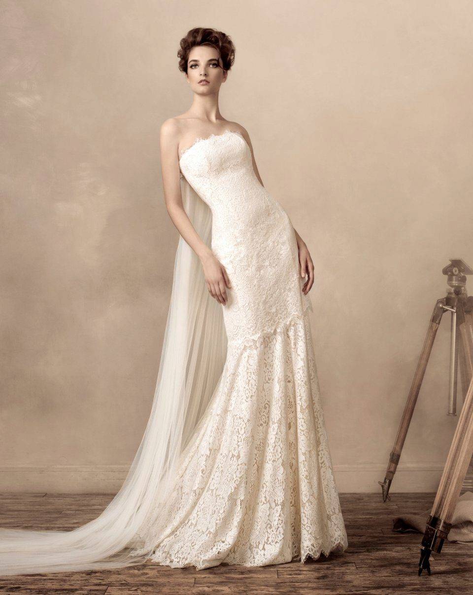 Подобные варианты осмеливаются примерить далеко не все. По-королевски роскошным станет кружевное одеяние со шлейфом. Изделие не отличается комфортностью, но его внешний вид покоряет с первого взгляда.