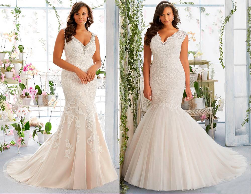 - Полнота – не препятствие для свадебного платья формы русалочка. Опять-таки, если пропорции тела правильные. На помощь придет корректирующее нижнее белье, которое максимально спрячет все лишнее. Нижняя часть свадебного платья не должна быть пышной и многослойной, отдавайте предпочтение цельнокроеному варианту.