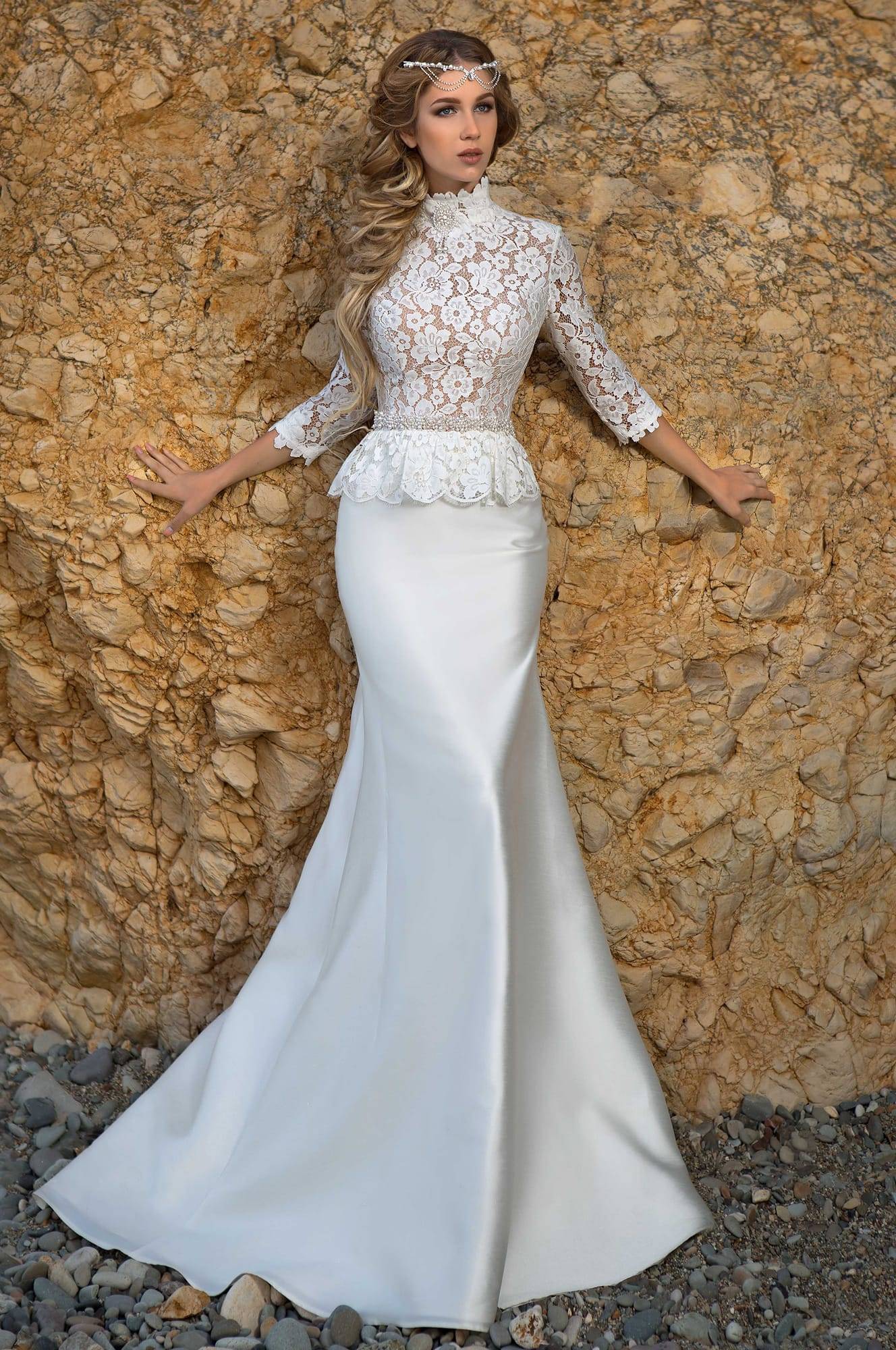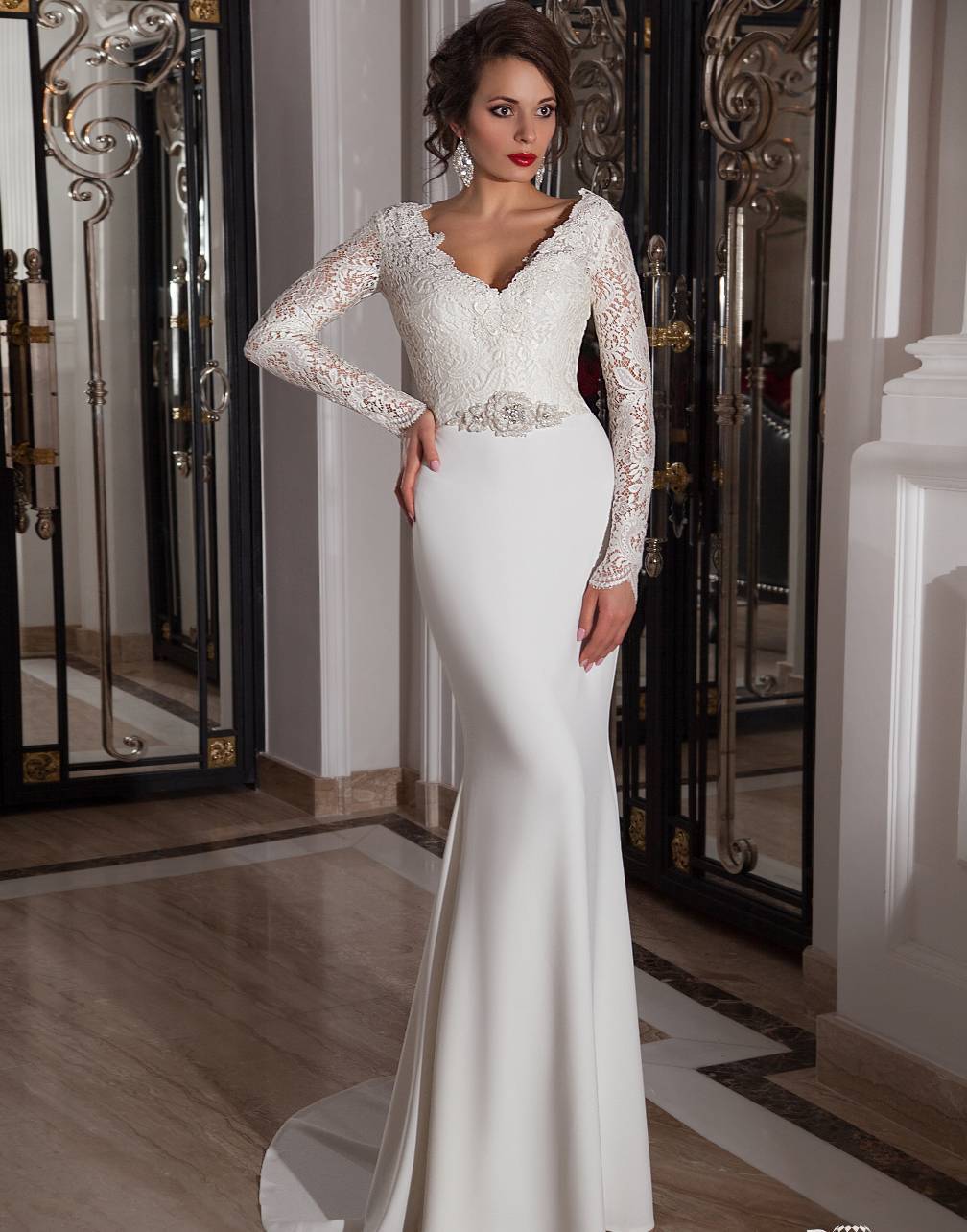 - с длинными рукавами. На порталах ру можно найти массу подобных нарядов. Чаще всего выбирается свадебное платье «русалка» с рукавами в том случае, если торжество приходится на зимний период. Выполняются данные детали из гипюра, идентичного верху изделия.