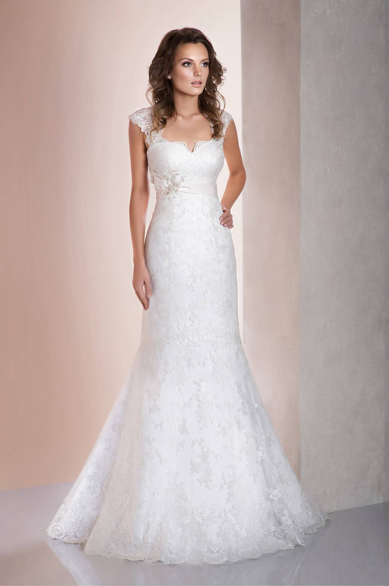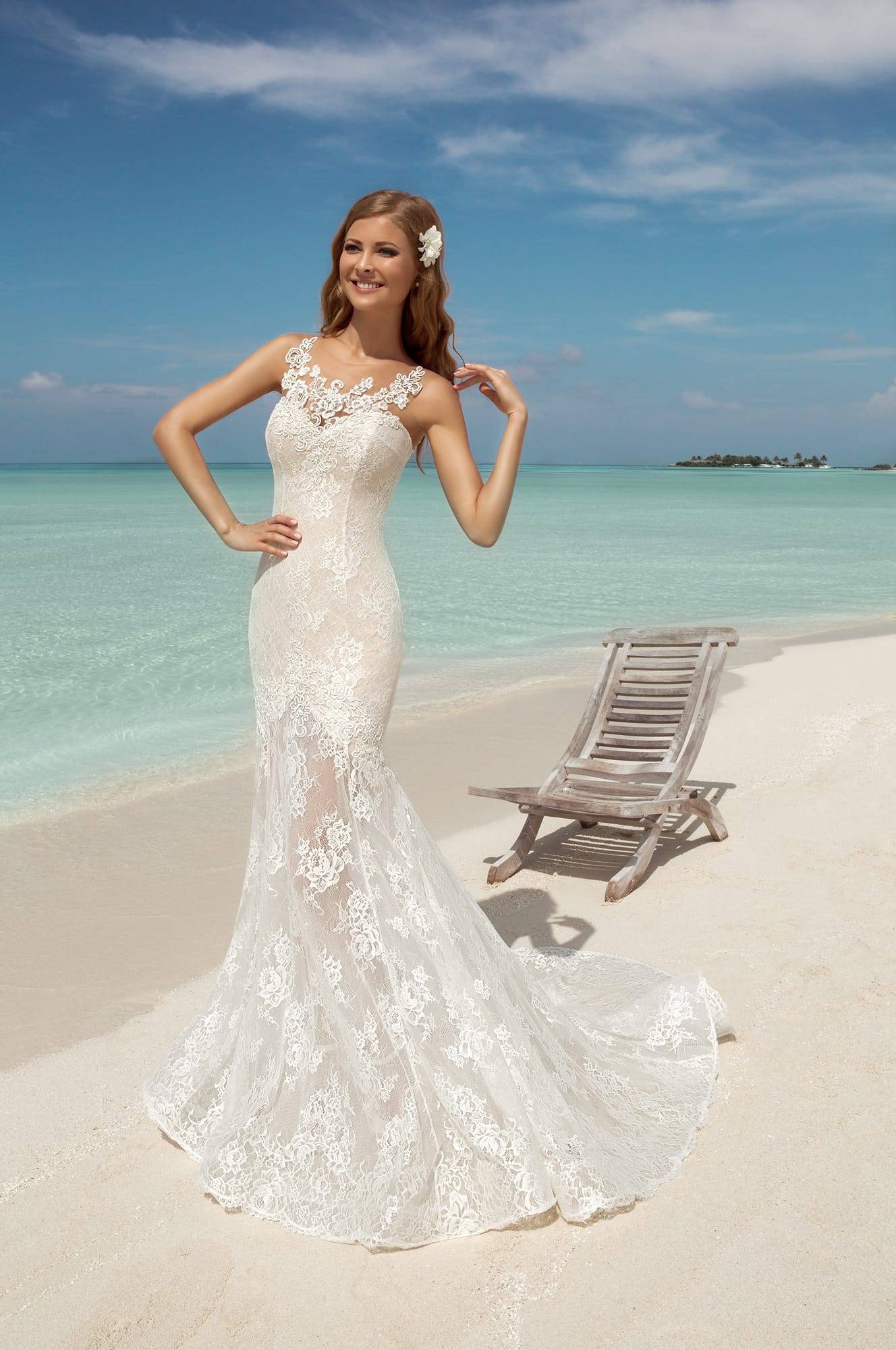 - Девушки небольшого роста, но с правильными пропорциями, могут позволить себе свадебное платье рыбка. В этом случае визуально добавить сантиметров можно, надев каблуки и выбрав модель с открытым декольте. От длинного шлейфа лучше отказаться.