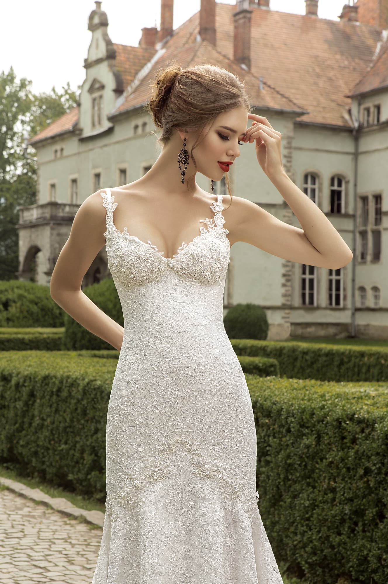 Свадебное платье рыбка без рукавов, имеющее тонкие лямки, – подходящее решение для торжества, проходящего в теплое время года. Его внешний вид не уступает остальным вариациям модного фасона. Бретели добавляют луку немного сексуальности.