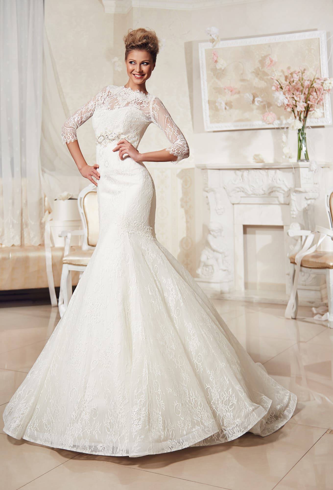 Свадебное одеяние фасона рыбка с рукавами смотрится изящно, легко. Дизайнеры предоставляют возможность экспериментировать с длиной, формой рукава, меняя в целом настроение лука. Вариант до кисти или локтя, длины ¾ или формы фонарик, реглан выглядит интересно, добавляя образу изюминки.