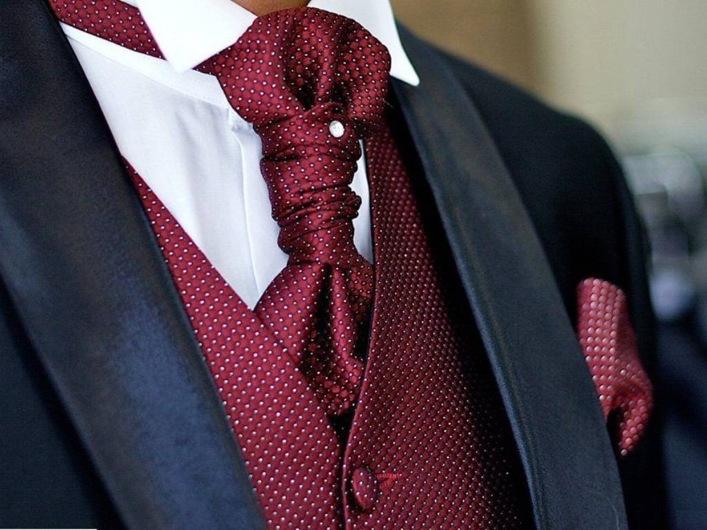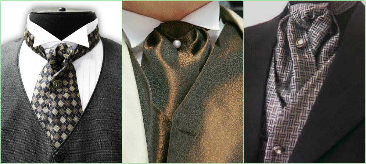 для особых случаев. К таковым относится аскот, шарпей и пластрон. Галстук-аскот – неотъемлемый атрибут мужского свадебного костюма в США и Западной Европе, представляет собой однотонный или с мелким рисунком шейный платок приглушенных тонов, завязываемый объемным узлом и закрепляемый булавкой. Часто носится с жилетом, сшитым из той же ткани.