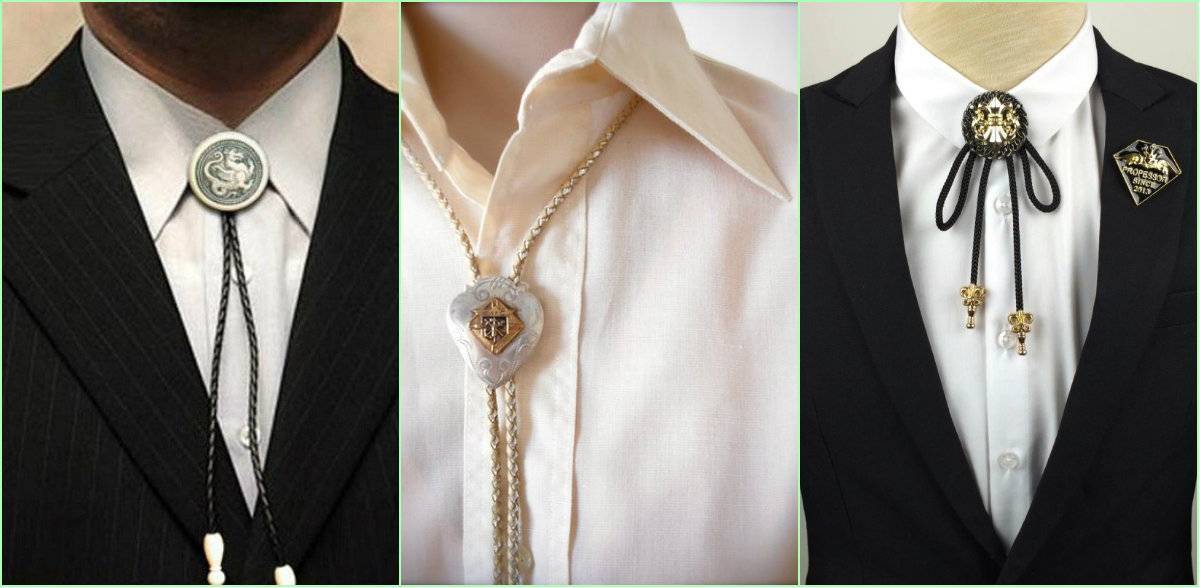 «боло» — галстук в виде шнурка с подвижным зажимом-брошкой. Такая модель пользуется особой популярностью американцев, которые надевают его с джинсовой рубашкой, замшевым пиджаком или костюмом кэжуал.