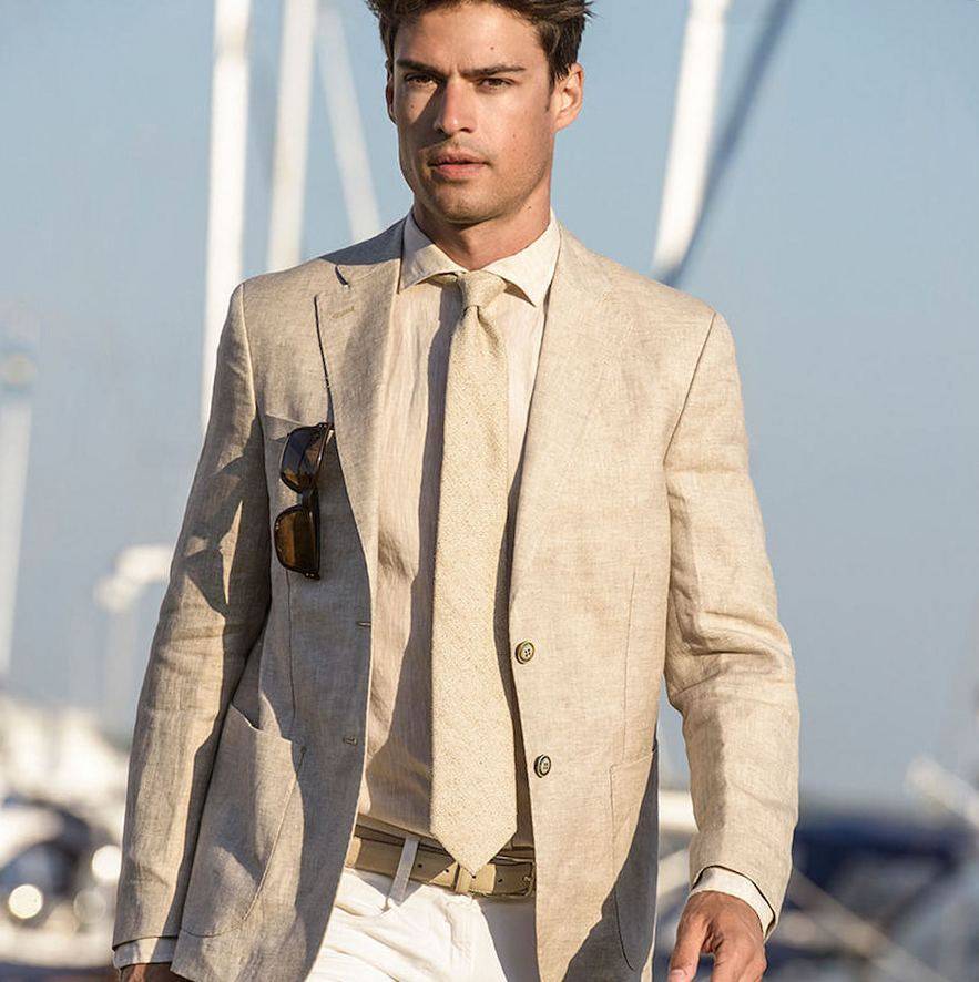 | Бежевый костюм | Бежевого цвета костюм – это также летний вариант, который можно оттенять яркими галстуками. Из разрешаемых оттенков выделяют белый и серый для строгого стиля, красный, бордовый и фиолетовый для неформального варианта. Также гармонично впишется аксессуар синего оттенка. |