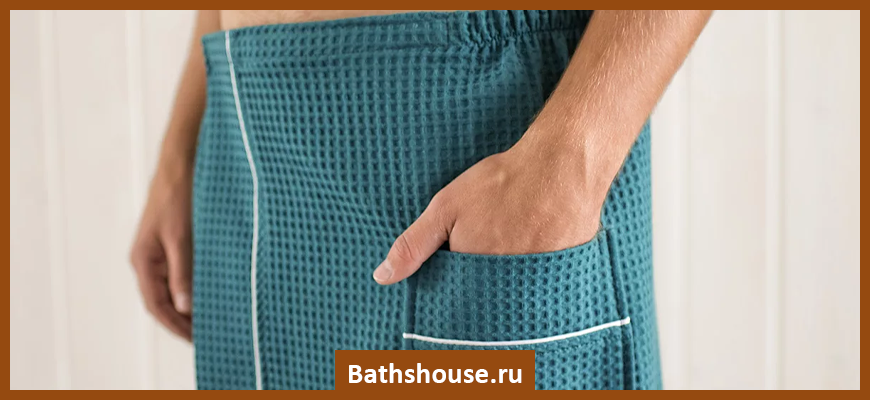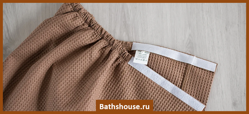 Модель отличается длиной, крой определяется параметрами тела. Женское полотенце с резинкой шьется с учетом расстояния от верхней части груди до колен (плюс/минус несколько сантиметров, что определяет длину). Это вещь на запах. Одна сторона изделия должна перекрывать другую. Сверху по краю проходит резинка, регулирующая размер. Тогда предмет одежды лучше фиксируется. В женском варианте часто предусматриваются крепления нескольких видов. Липучка (велкро) – дополняет основной. Выполняет сдерживающую функцию, не позволяет нижней части килта раскрываться при движении.