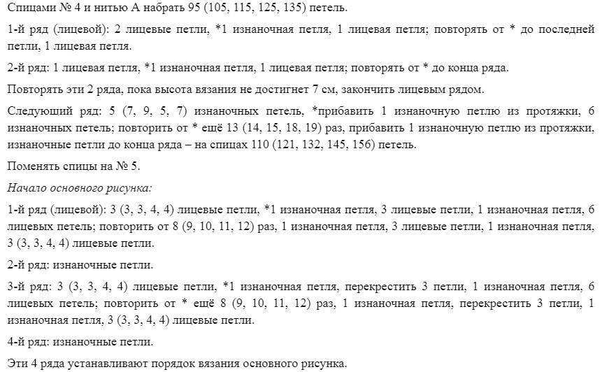 Возьмите шерсть (100г/166 м): по 2 (3, 3, 3, 4) мотка коричневого цвета (нить А), 2 (2, 3, 3, 3) мотка светло коричневого цвета (нить В) и 4 (5, 5, 6, 6) мотка цвета экрю (нить С), спицы №4 и 5.